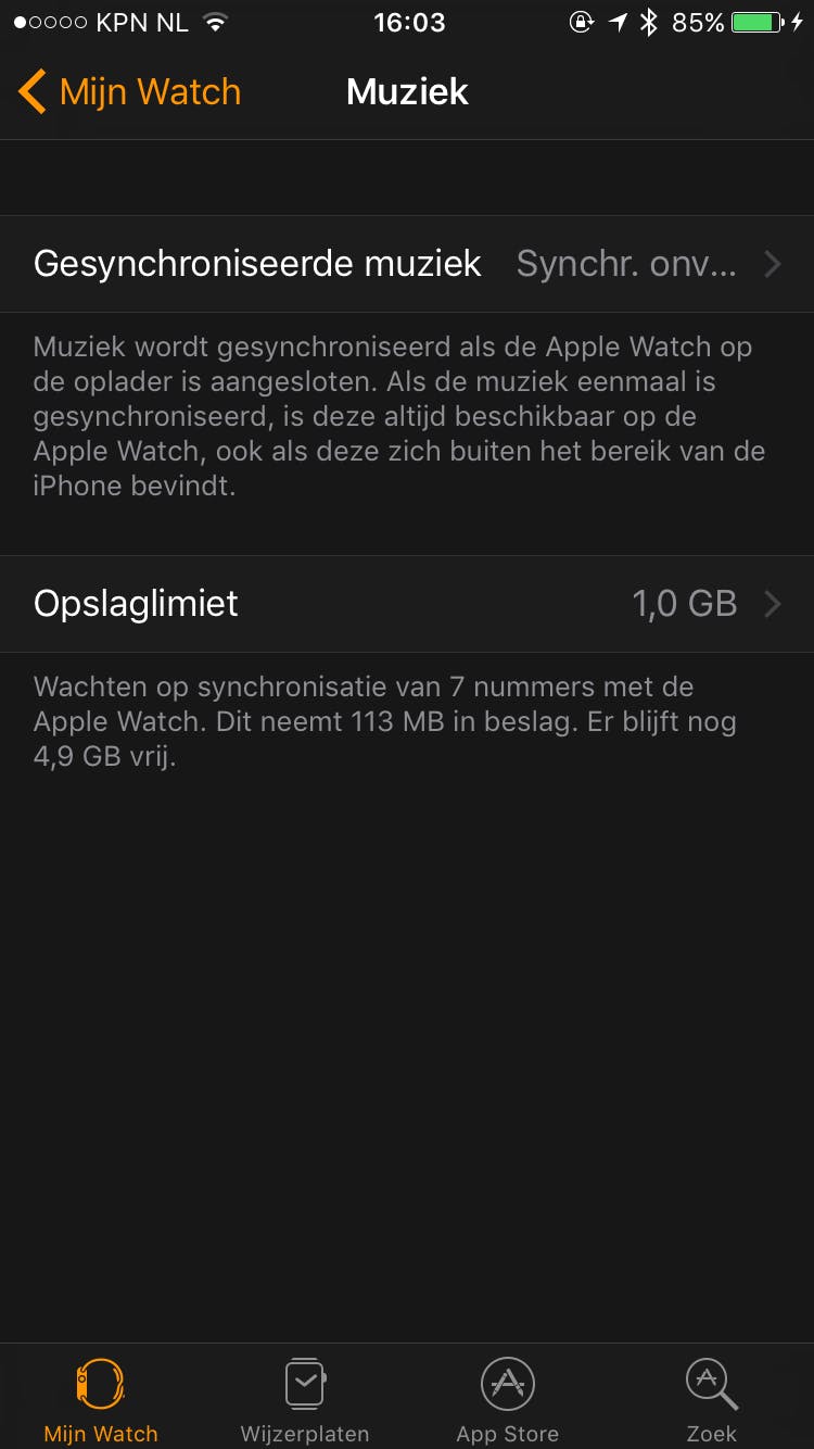 Is er niet genoeg ruimte vrij op je Watch voor je afspeellijst? Bij Opslaglimiet kun je bepalen hoeveel ruimte Muziek mag innemen op je Watch.