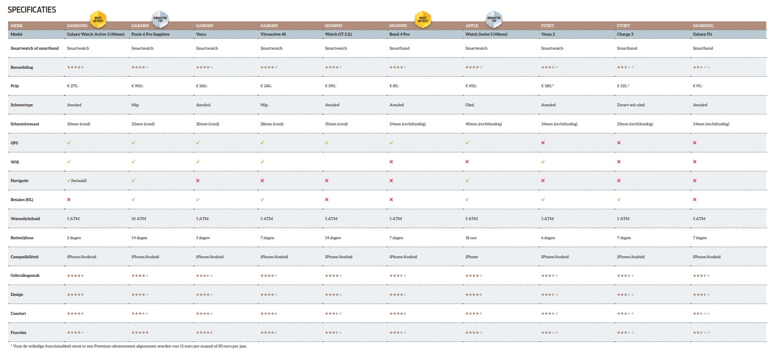 De prijzen die in de vergelijkingstabel aan het eind van dit artikel te vinden zijn, zijn de basisprijzen van de verschillende smartwatches en smartbands. In het geval van de twee Fitbit horloges kan daar echter nog een aardig bedrag bij komen. Het gaat dan niet alleen om de optionele bandjes of andere extra’s die vrijwel alle horloges bieden, maar om een abonnement op software. Wil je extra functionaliteit, dan moet je voor 11 euro per maand of 85 euro per jaar een abonnement nemen op de Premium-variant van de Fitbit smartphone-app, terwijl het marketingmateriaal de indruk geeft dat het standaard bij het horloge zit. Denk bij extra functionaliteit aan uitgebreidere informatie over je slaapritme, geanimeerde oefeningen en een rapport over je gezondheid.