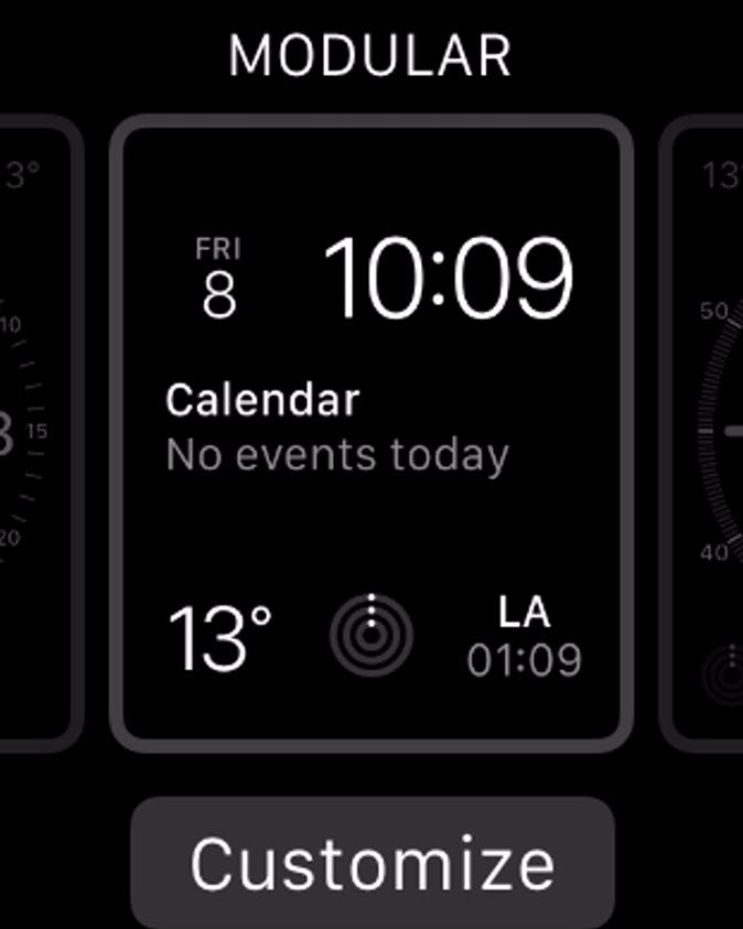 Naast het feit dat je andere wijzerplaten kunt kiezen, kun je ook de inhoud van iedere wijzerplaat aanpassen, bijvoorbeeld om er andere informatie in weer te laten geven. Dit gaat overigens verder dan we hadden gedacht en dat is erg fijn. Voer wederom een Force Touch uit op het display en navigeer naar de wijzerplaat van je keuze.