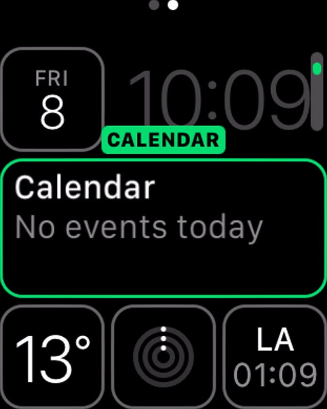 Druk nu op de knop Customize. Bovenin zie je twee stipjes, dat betekent dat je deze wijzerplaat op twee manieren kunt aanpassen. In het geval van de wijzerplaat in ons voorbeeld, is het eerste stipje het aanpassen van de kleur. Draai aan het kroonsteentje om de kleur aan te passen. Ben je tevreden, veeg dan naar links, voor het tweede optiescherm. Daar zie je uit welke elementen deze wijzerplaat is opgebouwd. Tik op een element dat je wilt aanpassen, zoals Calendar, en draai vervolgens aan het kroonsteentje. Je kunt dan kiezen uit de andere informatiecategorieën die je in dit element wilt weergeven. Zo kun je het horloge dus écht aanpassen aan je wensen.
