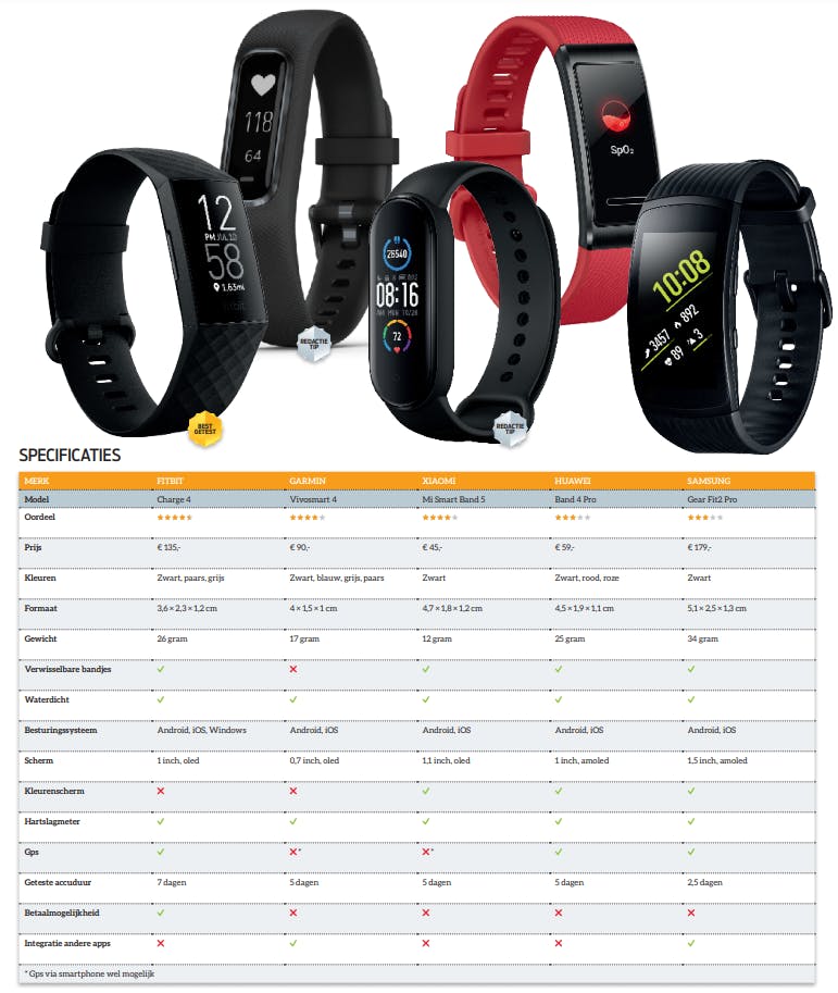 Het bekendste fitnessarmbandje is dat van Fitbit, dat met de Charge aan de wieg heeft gestaan van deze productgroep. In onze test komt het meest recente exemplaar aan bod. In deze test vergelijken wij de Fitbit Charge 4, de Garmin VivoSmart 4, de Huawei Band 4 Pro, de Samsung Gear Fit 2 en de Xiaomi Mi Smart Band 5.