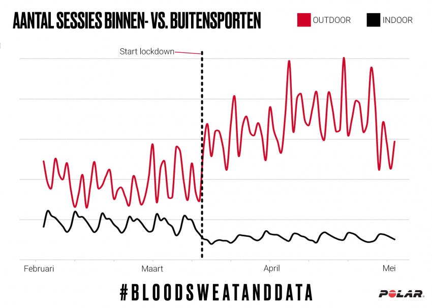Geen wonder, sportscholen waren die maanden gesloten en dat blijven ze voorlopig ook nog. Buitenactiviteiten vonden juist veel meer plaats. Hardlopen werd meer dan dubbel zo vaak geregistreerd, mountainbike-sessies stegen met 140 procent en tochtjes met de racefiets zelfs met 328 procent. De data is afkomstig van 'tienduizenden' Nederlandse Polar-gebruikers.