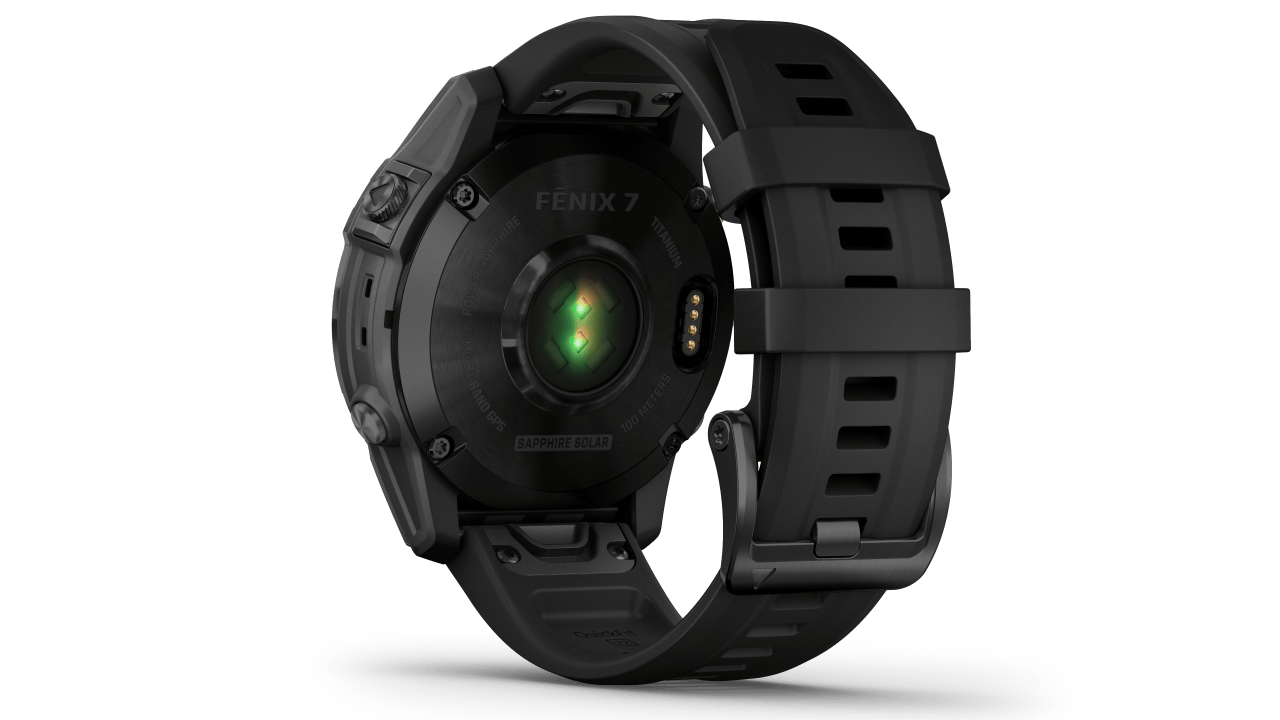 De Solar-modellen zoals de hier geteste Fenix 7 Sapphire Solar hebben in en onder het glas een zonnepaneel dat bij normaal gebruik en daglicht, de batterijduur enkele dagen kan verlengen. De zichtbare ring aan de buitenkant van het glas is duidelijk groter dan bij de eerdere Fenix-modellen.