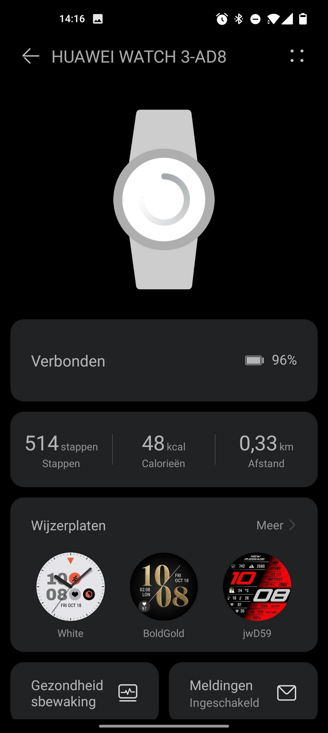 Het is mogelijk om het scherm te activeren wanneer je je pols optilt. Je kunt ook kiezen voor een altijd-aan-modus, waarin het scherm continue de tijd toont. Dat vind ik wel zo handig aan een horloge, maar de altijd-aan-modus van de Watch 3 valt mij wat tegen. De keuze uit wijzerplaten is beperkt en de wijzerplaat die ik kies, wordt niet weergeven. Volgens de app heeft dit met het thema van de software te maken en krijg ik daarom een andere wijzerplaat te zien in de altijd-aan-modus. Dat vind ik vervelend omdat deze wijzerplaat de tijd kleiner weergeeft en niet de gewenste uitstraling heeft. Een keuze aanbieden die niet mogelijk blijkt vind ik simpelweg dom.