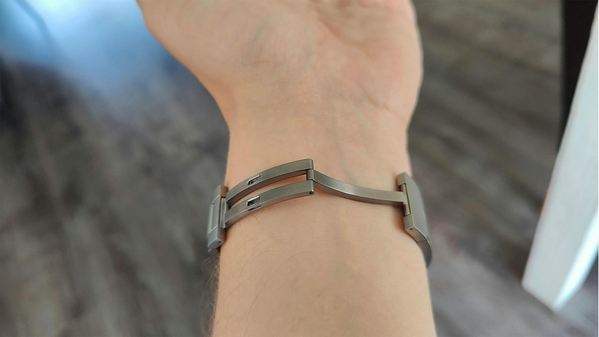 Wij testen het model van 500 euro. Dat is belangrijk om te weten, omdat die versie een speciale armband heeft. Het kliksysteem biedt aanvankelijk één maat aan, waardoor niet iedereen dat ding om z’n pols kan dragen. Misschien is je pols te smal of te breed – je komt er alleen achter op het moment dat je hem een keertje om doet. Je kunt de schakels er wel tussenuit halen als je dat wil, waardoor de band kleiner wordt. Maar heel snel groter maken, lukt niet. Je krijgt er geen extra schakels bij.