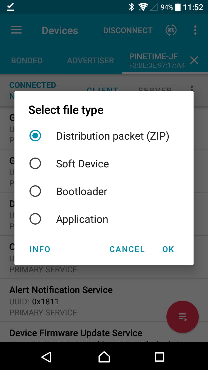 Download op je telefoon de nieuwste release van InfiniTime. Download het zip-bestand onder de Assets. Open de app nRF Connect, scan naar apparaten en druk naast het apparaat Pinetime-JF op Connect. Daar zie je nu rechts bovenaan naast Disconnect een icoontje DFU met twee cirkelvormige pijltjes. Druk daarop, selecteer Distribution packet (ZIP) en kies OK. Selecteer vervolgens het zojuist gedownloade zipbestand.