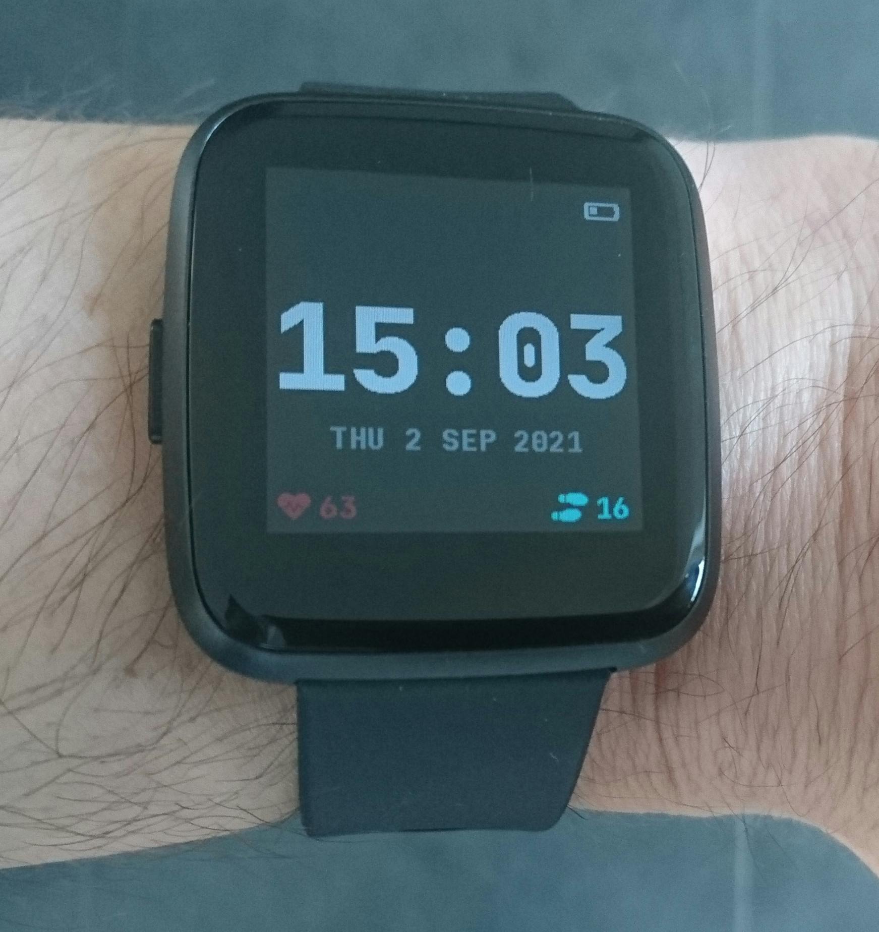 Als dit alles achter de rug is, ben je klaar om de PineTime te gebruiken. Standaard start InfiniTime op met de digitale klok, die is ingesteld op 1 januari 1970 (het Unix-epoch). Je kunt de tijd niet vanaf de PineTime zelf correct instellen. Dat doe je met een van de apps die de PineTime ondersteunen. Boven de klok zie je een icoontje met de batterijstatus, en als er een bluetooth-verbinding actief is ook een blauw Bluetooth-logo. Onder de klok zie je links je hartslag als de hartslag-app actief is en rechts het aantal stappen dat je vandaag hebt gezet.