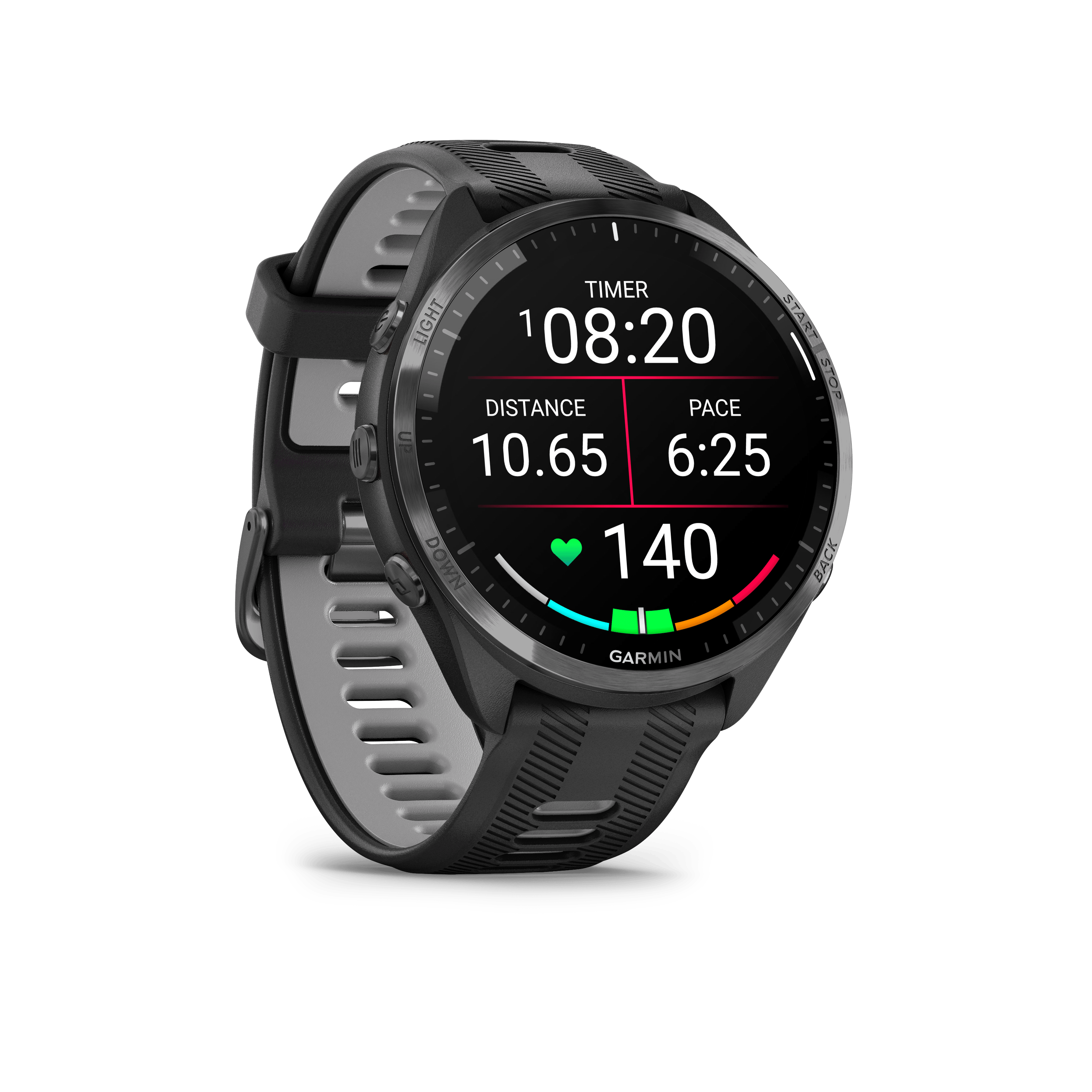 De Forerunner 965 weegt 52 gram en is 47 mm groot en 13,2 mm dik. Het draagt fijn ook dankzij de zeer soepele siliconen-band. Het scherm is 35,4 mm in diameter met een resolutie van 454 x 454 pixels. Iets meer pixel dus dan bij de Forerunner 265. De 965 beschikt over 32 GB geheugen wat zich vooral uitbetaalt in meer en snellere weergave van trainingsdata, vooraf geïnstalleerde topografische, wegen- en trailkaarten en bij het bewaren op de Forerunner van een eigen muziekselectie.