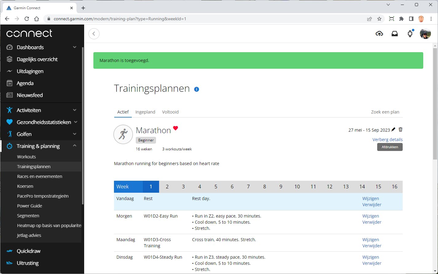 Daarbij biedt Garmin met Connect toch al het beste en meest uitgebreide online platform met prima bijbehorende apps. Via het platform en de apps worden alle gegevens gesynchroniseerd maar kun je ook meer en diepere analyses maken, trainingen inplannen of ook laten inplannen. Want Garmin biedt steeds meer hulp bij het verbeteren van de sportieve presentaties. Wil je voorbereiden op een halve of hele marathon dan kun je met een paar klikken een schema met verschillende trainingen laten inplannen. Elke training is daarna ook bekend op de Forerunner en kan eenvoudig worden geactiveerd en daarna gevolgd. Gaat het om een interval dan geeft een geluidssignaal of trilling bijvoorbeeld aan dat je naar een volgende interval moet of dat de hartslag hoger ligt dan bedoeld.