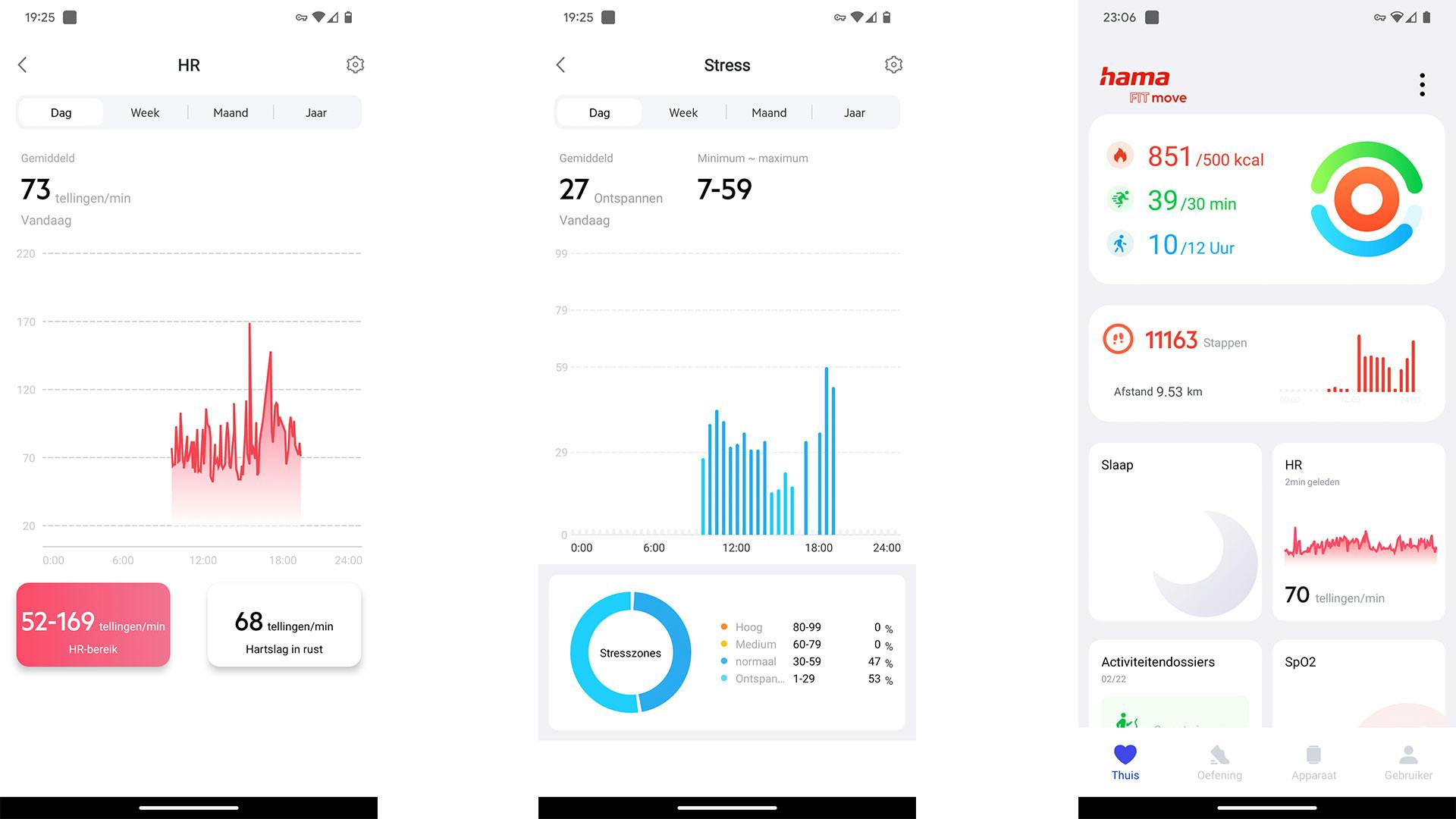 Met de Hama Fit Watch 6910 kun je een aantal dingen opmeten. Je slaap, het zuurstofgehalte in je bloed, je hartslag, je stressniveau en hoeveel stappen je gezet hebt. Je vindt al deze informatie gewoon op het schermpje. Het overzicht van alle activiteiten en resultaten tref je dan weer in de app aan, maar in principe kun je ook zonder. Wanneer je aan een training begint, dan kan de tracker automatisch sporten herkennen; maar om er echt zeker van te zijn dat er geen zweetdruppel verloren gaat, doe je er goed aan één van de veertiende ondersteunde sporten handmatig te activeren.