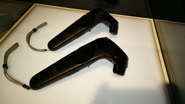 HTC levert twee losse controllers mee, die wat weghebben van de oude joysticks van vroeger. Aan de achterkant zitten er triggers en je duimen rusten op een aanraakgevoelige vierpuntdruktoets. De controllers zijn draadloos verbonden met de headset, het is alleen wel jammer dat de headset zelf met een draad vastzit.