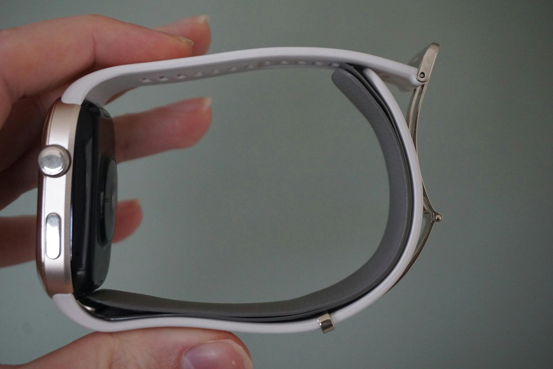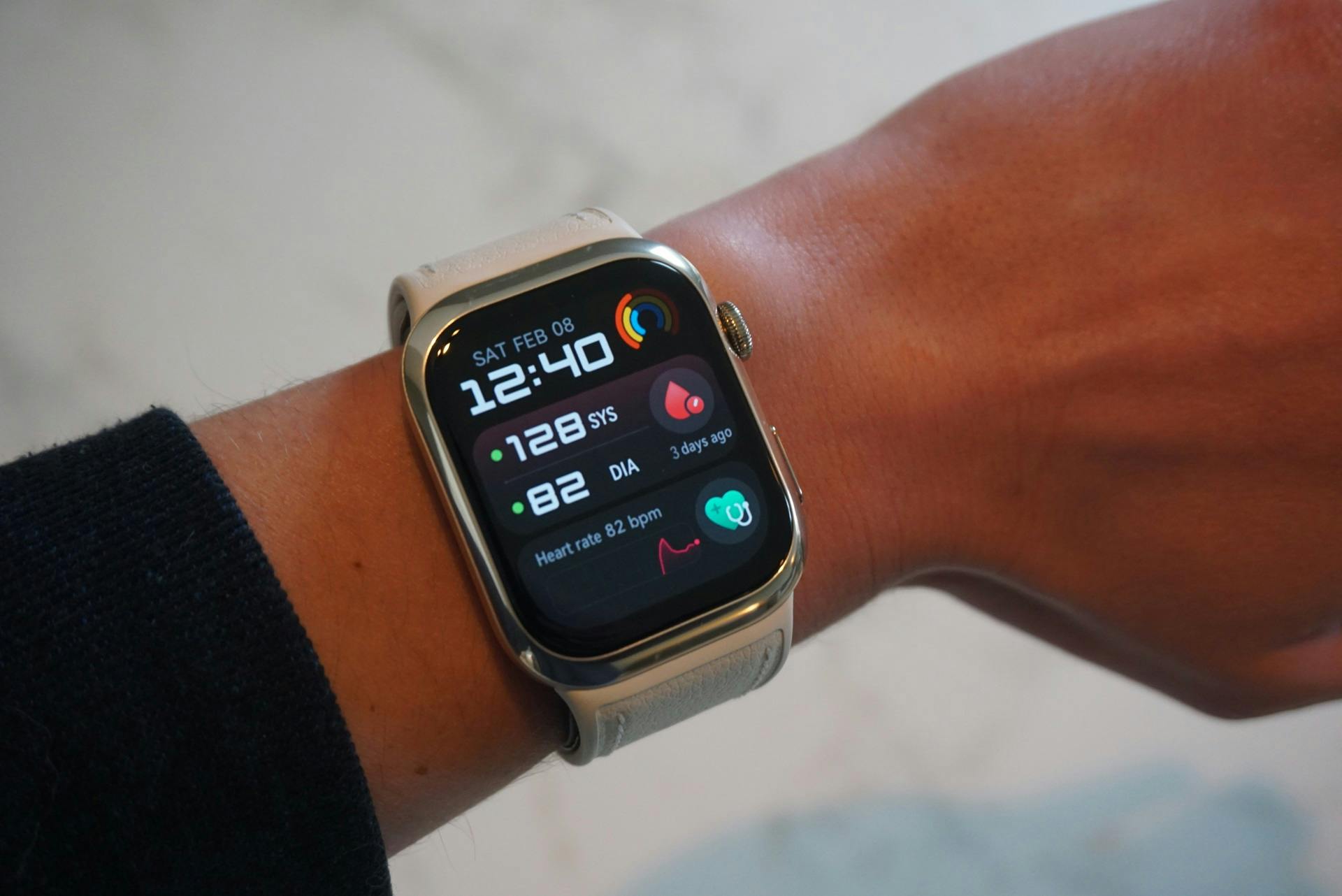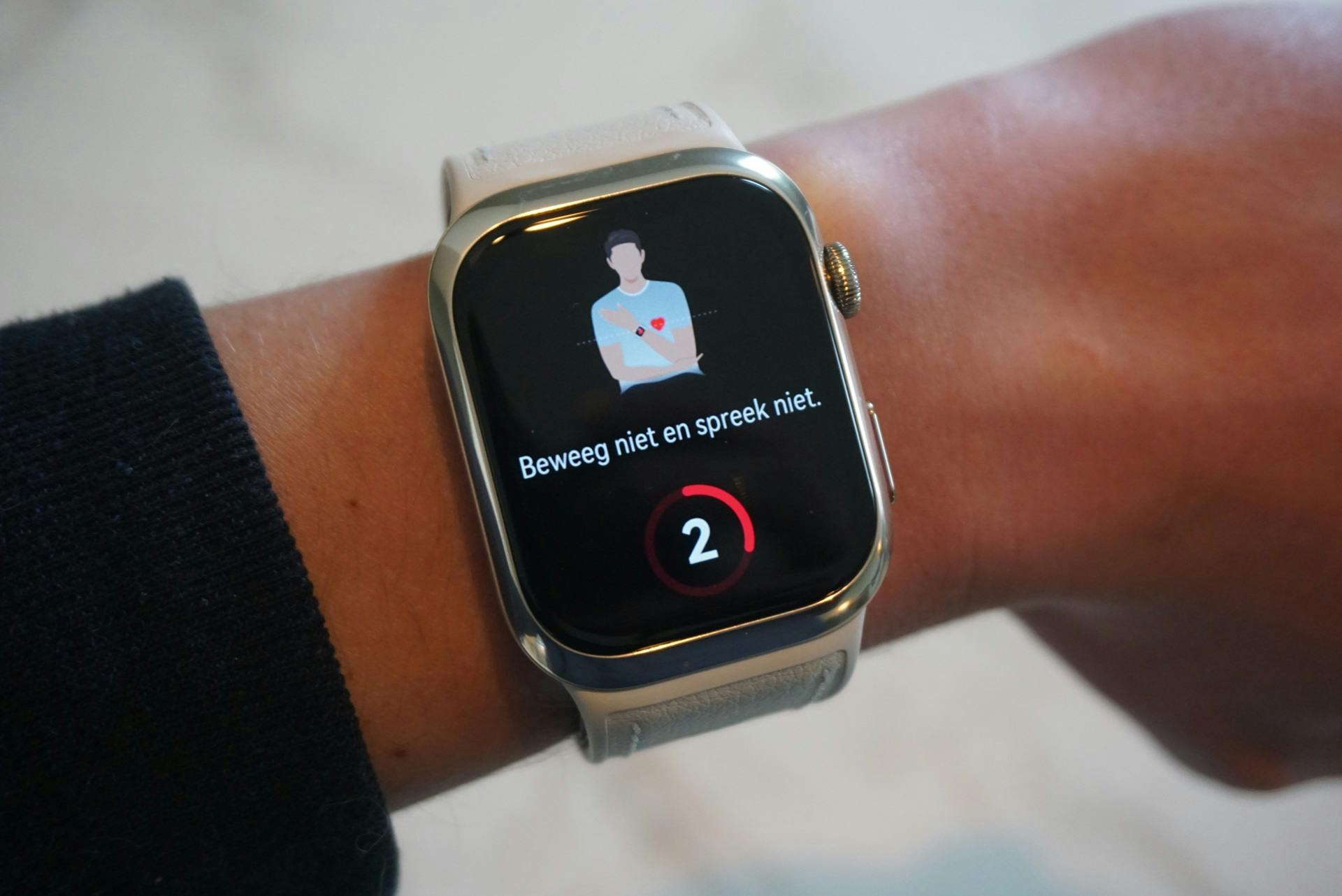 Laten we beginnen met de bloeddrukmeter. Die is verwerkt in de smartwatch en werkt samen met het speciale horlogebandje, dat uit meerdere delen bestaat. Als je op het horlogescherm aantikt dat je een bloeddrukmeting wilt starten, blaast het bandje zichzelf letterlijk op om strak om je pols te zitten. Dat voel je, en de eerste dagen is dat bijzonder. Niet dat het bandje zo strak zit dat het pijn doet, maar je bent je plotseling heel bewust van het bloed dat door je onderarm stroomt.