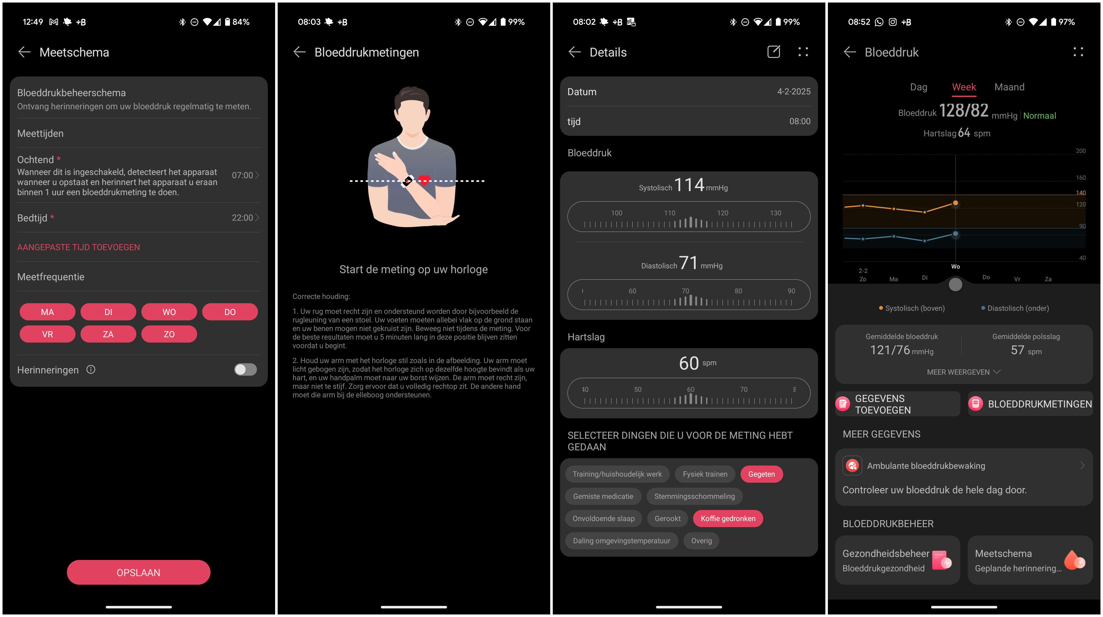 De bloeddrukmeting duurt nog geen minuut. Omdat de test snel uit te voeren is, is de drempel om het te doen ook laag. Wel is het belangrijk dat je rekening houdt met de randvoorwaarden om tot een accurate bloeddrukmeting te komen. Zo raadt Huawei het – op basis van wetenschappelijk onderzoek – af om een test te doen als je net koffie op hebt of bijvoorbeeld aan het sporten bent.