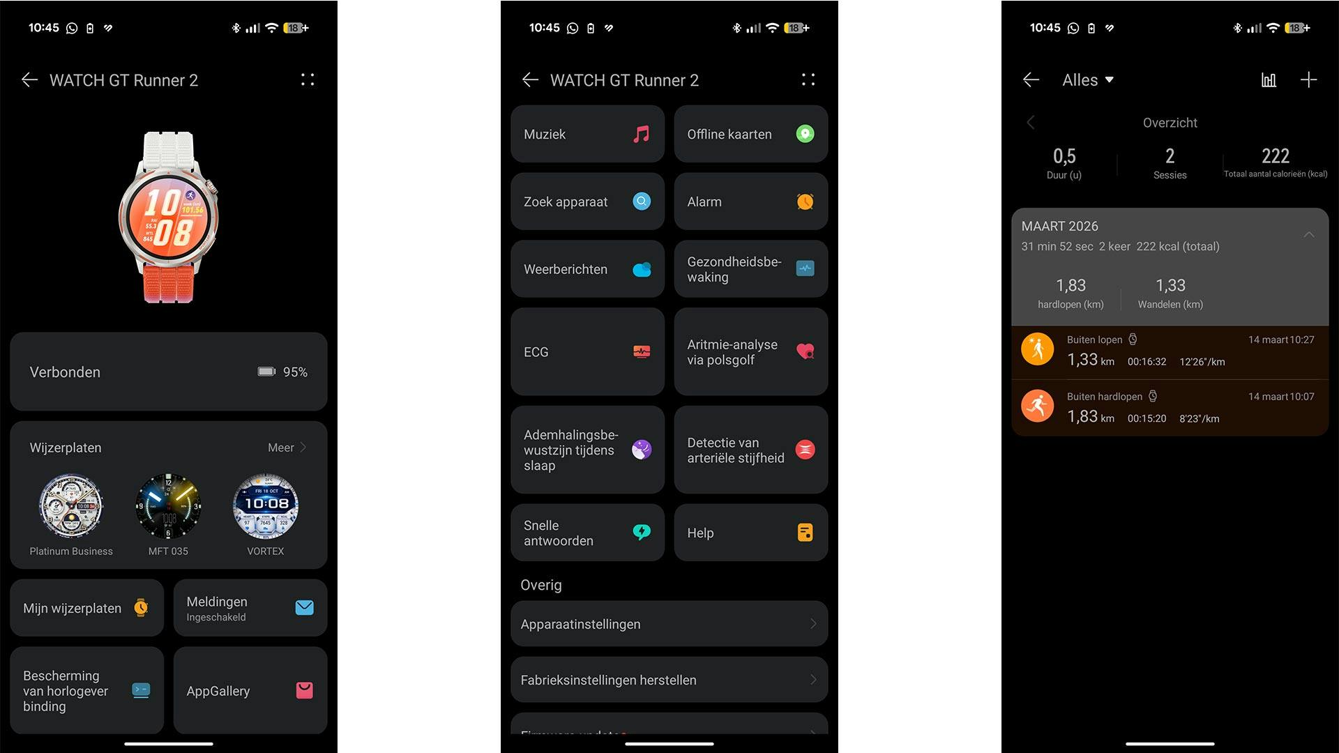 Voor de beginners onder ons: het voelt een beetje alsof je de dataverwerking en -presentatie van een professionele (hard)loopband om je pols hebt zitten. De GT Runner 2 houdt je tempo, hartslag(zones), kracht, balans per voet, hardloopvermogen in watt en nog veel meer bij, waardoor je niet om informatie verlegen zit. Al die data synchroniseert het systeem met de app, waardoor je achteraf alles op je gemak kunt inzien.
