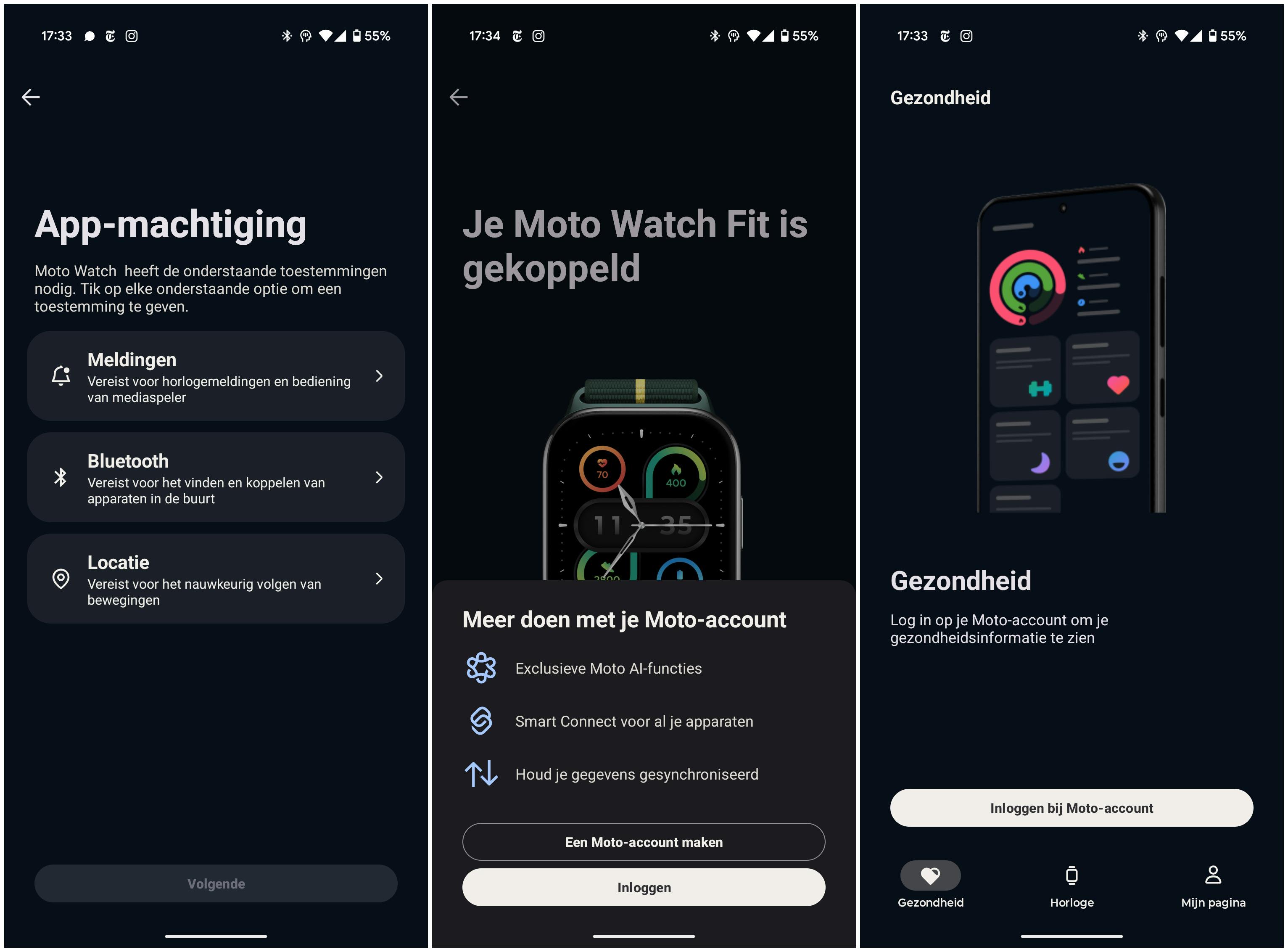Houd er rekening mee dat de Moto Watch Fit alleen werkt met een Android-smartphone (dat hoeft geen model van Motorola te zijn). Als je een Apple iPhone gebruikt, kun je niets met de Moto Watch Fit. Na het installeren van de Moto Watch-smartphoneapp en het verplicht aanmaken van een Motorola-account, koppel je de fitnesstracker aan je smartphone. Je kiest een wijzerplaat, stelt in welke app-meldingen wel en niet op je horlogescherm mogen verschijnen en kunt andere zaken aanpassen. De app werkt prima en geeft ook duidelijk inzicht in gezondheidsstatistieken die door het horloge verzameld zijn.