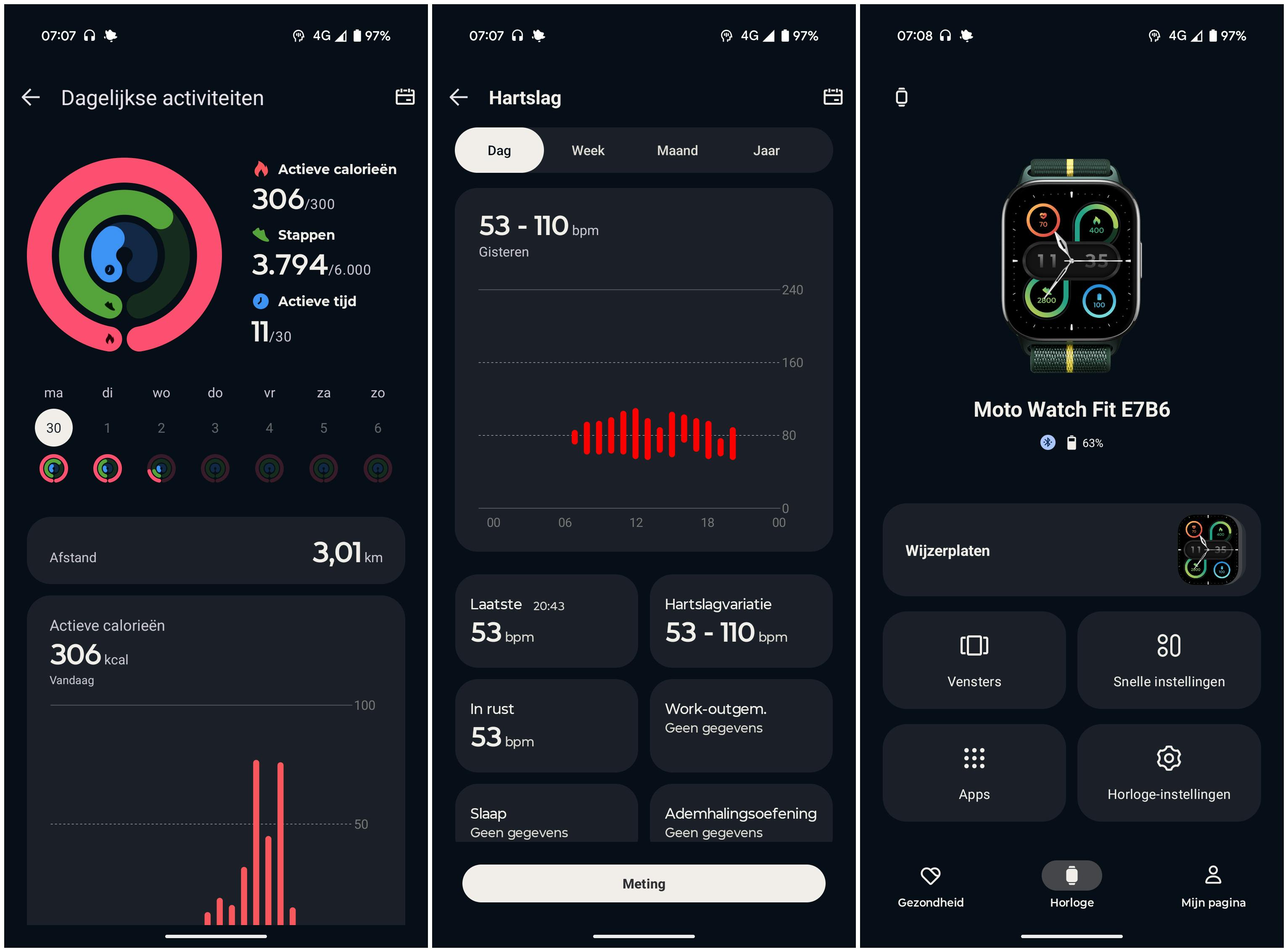 De Moto Watch Fit kan aardig wat zaken meten. Van je stappen en je slaap tot sportieve sessies, je hartslag en hoeveel calorieën je verbrandt. Veel metingen vinden we – afgezet tegen nauwkeurig bewezen wearables – goed genoeg, maar de hartslagmeter van de Watch Fit zit vaak te hoog. Gelet op het prijspunt zijn we tevreden over hoe de fitnesstracker onze gezondheid in kaart brengt, maar zoals Motorola zelf ook aangeeft: staar je er niet blind op en gebruik de wearable niet voor medische doeleinden.