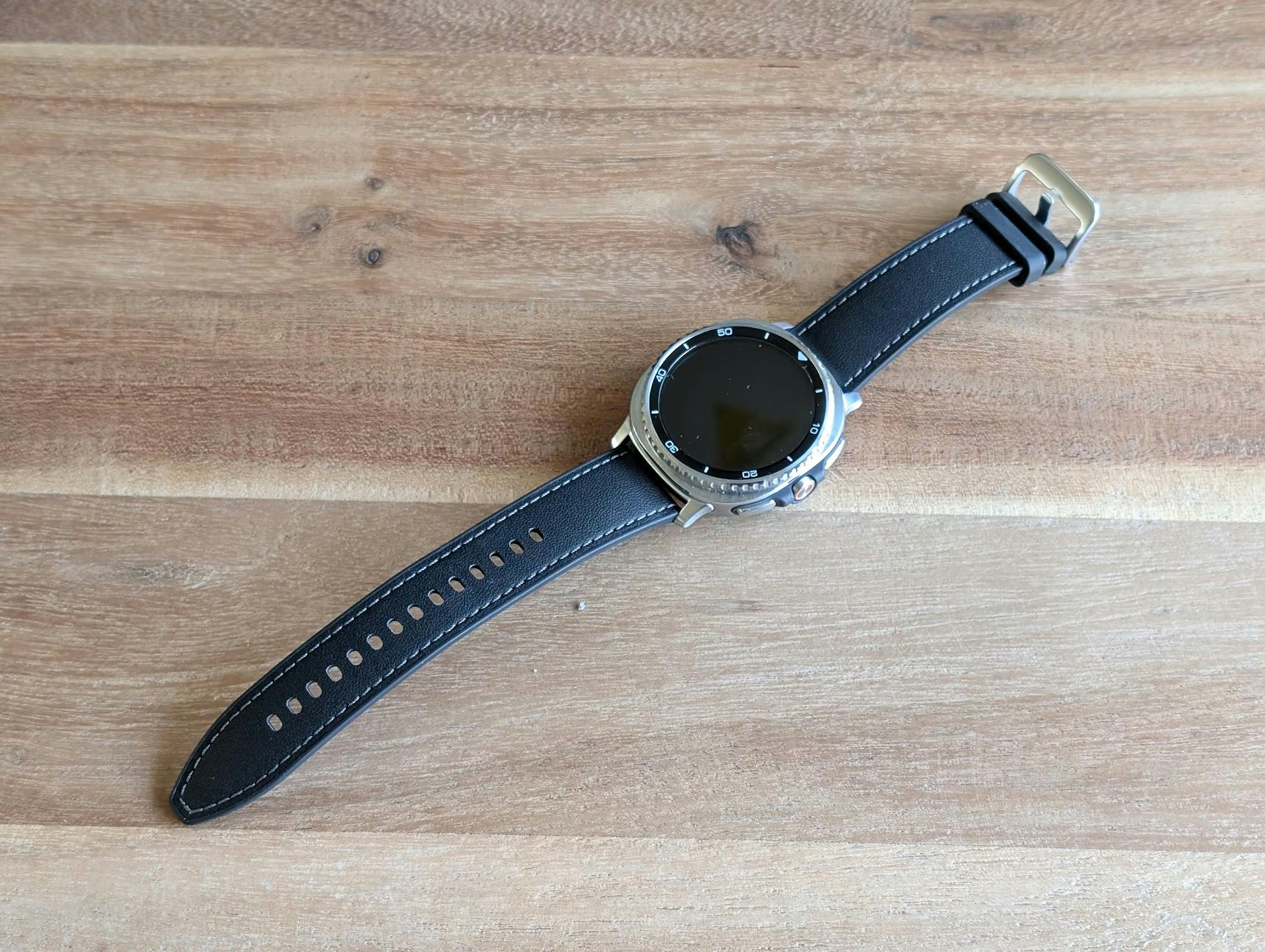 Het horloge heeft een stevig roestvrijstalen ontwerp en een comfortabel, chic ogend kunstleren bandje. We vinden de smartwatch wel aan de dikke kant, wat je vooral merkt als je hem onder een strakker overhemd draagt. Op de zijkant vind je drie fysieke knoppen. Die gebruik je – net als de draairing – om door de software te navigeren, maar ook om een favoriete app naar keuze te starten. Je stopwatch bijvoorbeeld.