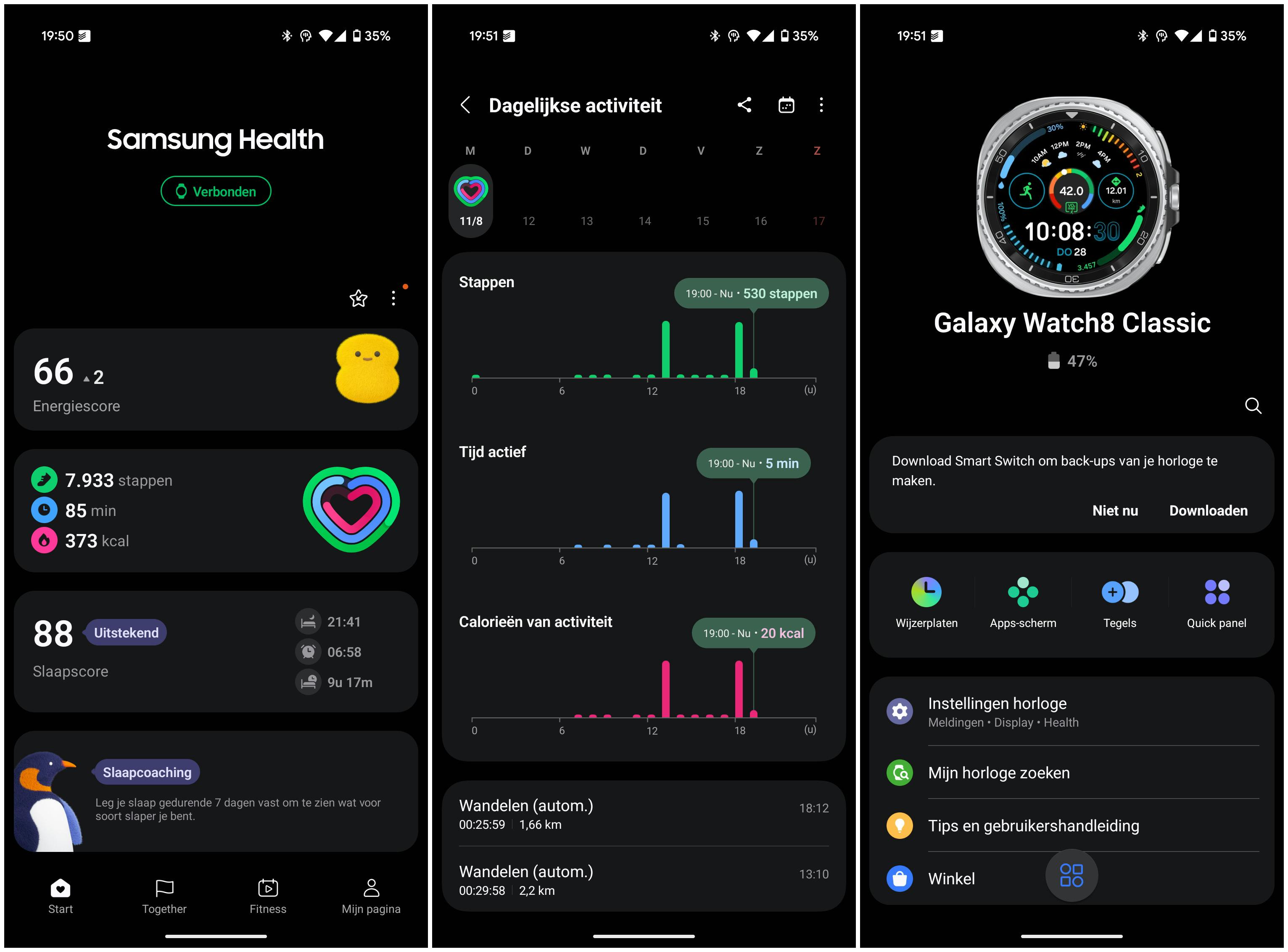 Dat je hiermee een Samsung-smartwatch in huis haalt, merk je aan verschillende dingen. Je hebt bijvoorbeeld niet per se een Samsung-smartphone (wel een Android-toestel) nodig om de Watch 8 Classic te kunnen gebruiken, maar sommige functies werken wel alléén met een Samsung-telefoon. Op je telefoon moet je bovendien twee Samsung-apps installeren: de Galaxy Wearable-app om de instellingen van het horloge aan te passen en de Samsung Health-app om de verzamelde gezondheidsstatistieken van het horloge te bekijken. We verbaasden ons vorig jaar al over het feit dat Samsung niet gewoon één complete app maakt. Dat is helaas dus nog steeds het geval.
