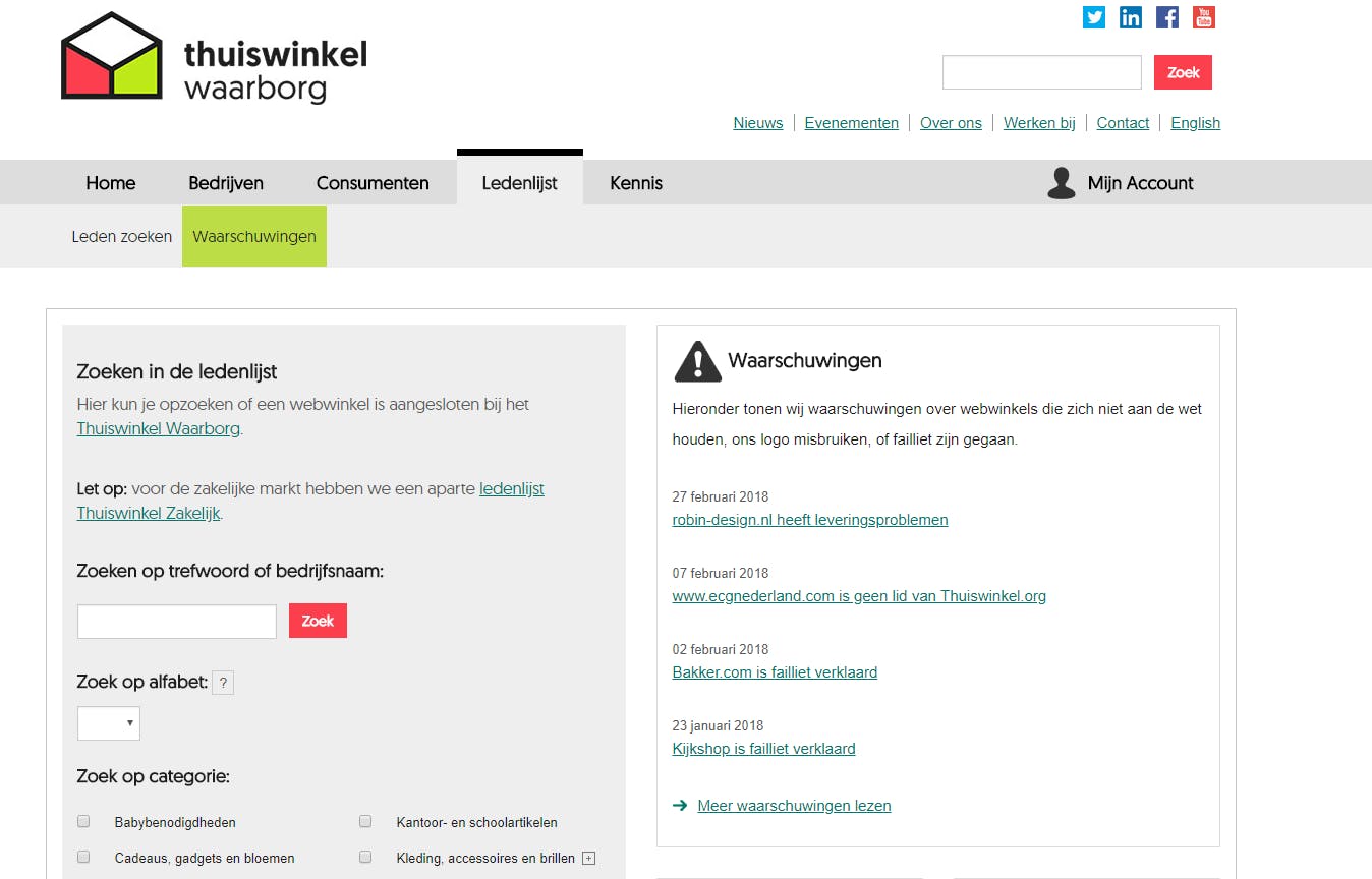 Een winkel die totaal niet betrouwbaar is, zal waarschijnlijk niet aangesloten zijn bij het Thuiswinkel Waarborg. Dat wil echter niet zeggen dat een site die het logo van het Thuiswinkel Waarborg op de site heeft staan, ook direct betrouwbaar is. Sommige sites plaatsen namelijk gewoon het logo en zijn helemaal niet aangesloten bij de organisatie. Je kunt dat heel eenvoudig controleren door naar www.thuiswinkel.org te gaan en daar te klikken op Ledenlijst. Je kunt dan het gehele ledenbestand doorzoeken én je vindt er een overzicht met waarschuwingen van bedrijven die zich op dit moment niet aan de regels houden of het logo van het Thuiswinkel Waarborg ten onrechte gebruiken. Het is trouwens niet zo dat winkels die lid zijn van het Thuiswinkel Waarborg niet failliet kunnen gaan of dat je verzekerd bent tegen je verlies als dat gebeurt, maar de kans dat het oplichters zijn is nagenoeg nihil, omdat ze anders niet door het certificatieproces waren gekomen.