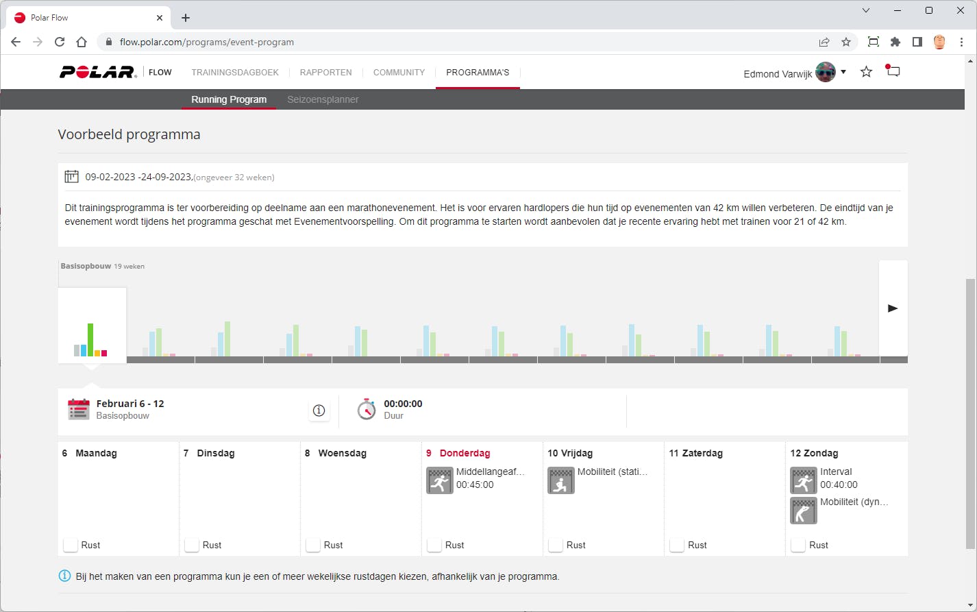De kalender is ook de plek om een training te plannen. Dat kan per training, maar het is ook mogelijk een trainingsprogramma of seizoensplanning te maken. Bij de programma’s is de keuze beperkt tot loopevenementen, dus 5 of 10 km of een halve of hele marathon. Wel kun je daarbij ook romp- en krachttrainingen opnemen. Eerdere trainingen en ook routes uit Strava of Komoot kunnen hergebruikt worden.