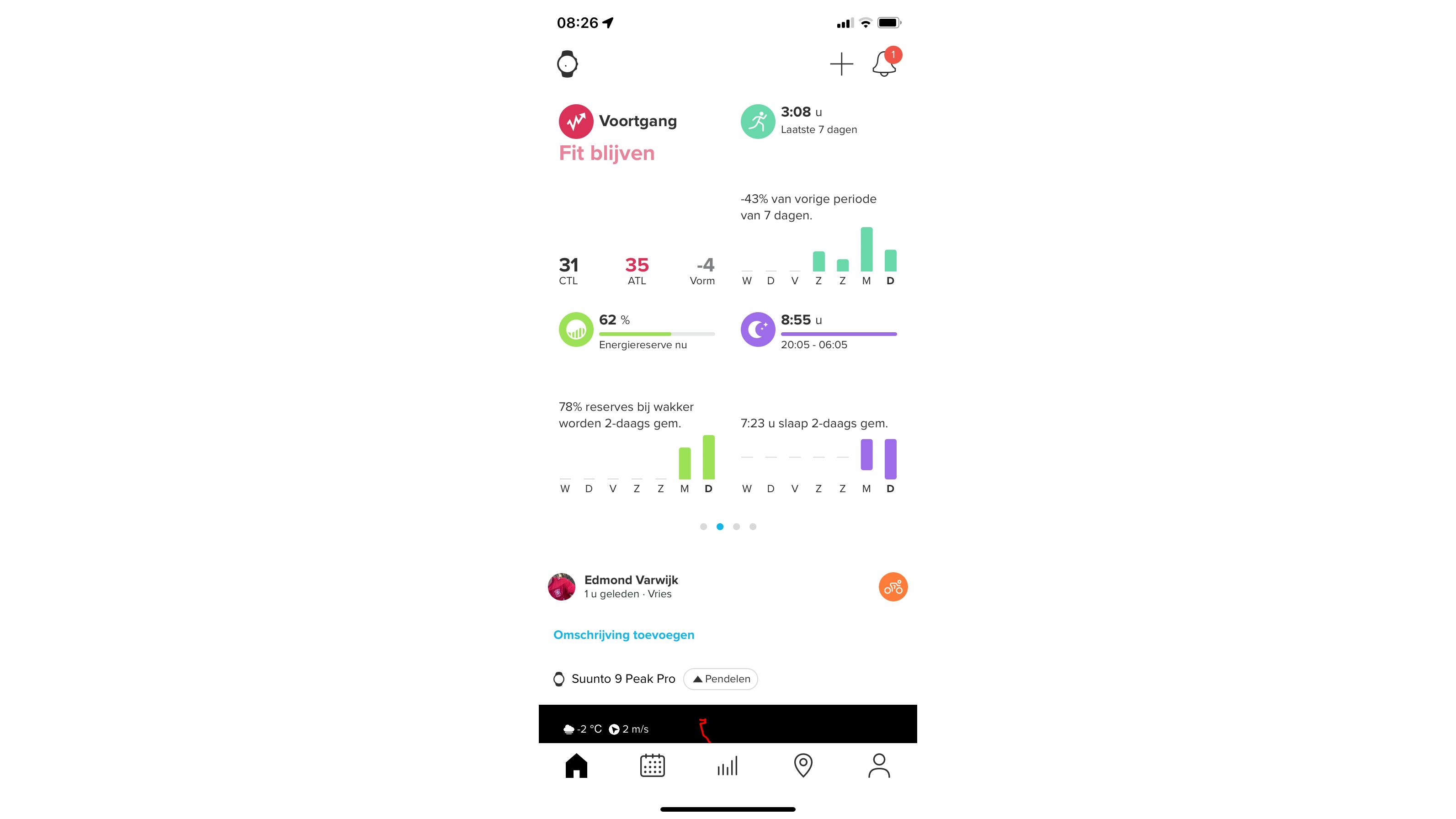 Het besluit van Suunto om het webplatform Movescount los te laten en haar sporters alleen nog apps aan te bieden, blijkt een goede keuze. De focus op apps betaalt zich uit in fraaie apps, met veel functionaliteit en een echte iPad-versie naast een app voor iPhone en Android. Er is een kalender waarop de trainingen staan met voor elke sport zijn eigen kleur. De meest recente training wordt met meer statistieken en een kaart getoond. Swipen naar links levert een tweede pagina op met trends en overzichten. Voor analyses over een langere periode is er onder aan het scherm toegang tot een onderdeel waarin trainingen, voortgang en ook slaapanalyses kunnen worden bekeken. Dit is wel het onderdeel waar vanwege de dunne grafieken de iPad-versie te prefereren valt.