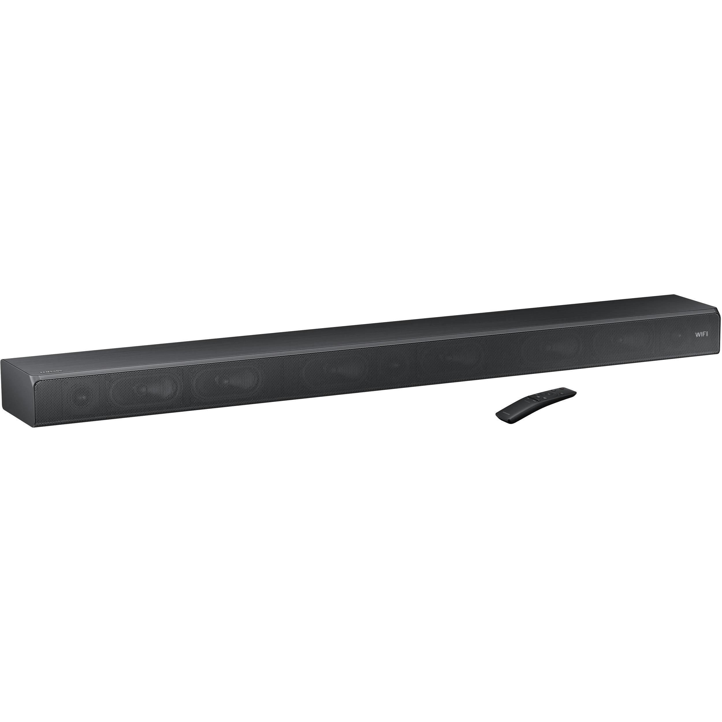 Dat de HW-MS650 in de categorie ‘compact’ wordt geplaatst, lijkt misschien een grap. De soundbar zelf is immers niet bepaald klein. Je mag hem zelfs relatief groot noemen, want hij heeft dezelfde lengte als een 55-inch-tv. De Samsung-soundbar is echter wel compact te noemen als je weet dat de subwoofer – die meestal een apart toestel is – bij deze soundbar is ingebouwd. Je krijgt dus volwassen basprestaties uit één apparaat, belooft Samsung. De HW-MS650 is twee jaar oud, maar verkoopt nog altijd heel goed en voor een lagere prijs. Maar dat betekent wel dat deze soundbar niet inhaakt op het SmartThings-platform, zoals de nieuwe Samsung-soundbars wel doen. Er is wel streaming- via de oude Multiroom-app met veel opties; de vraag is hoelang de ondersteuning blijft.