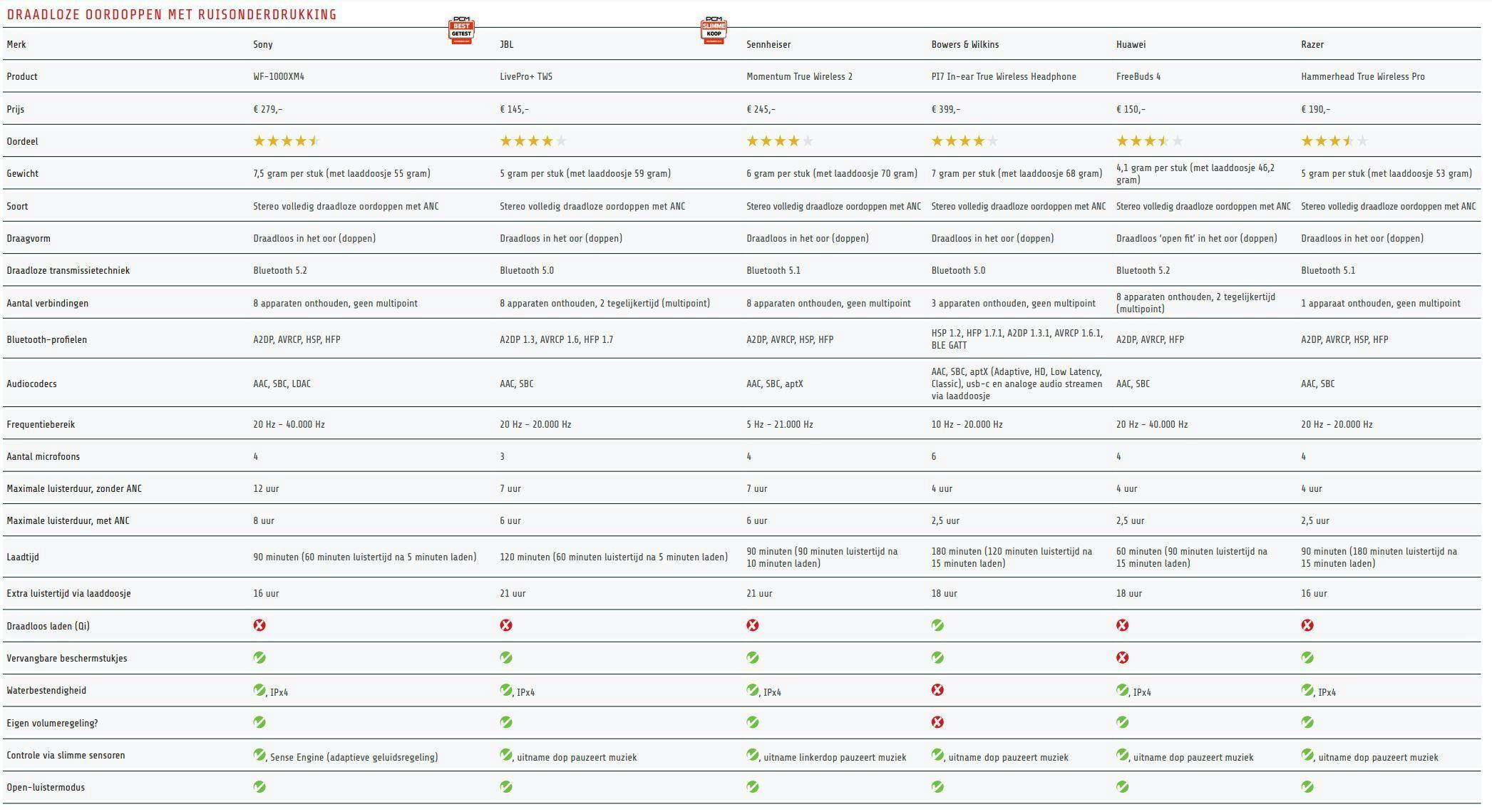 Dat ontbreekt alleen bij de oordoppen van Bowers & Wilkins. Maar die hebben dan weer als enige een laadetui dat ook als draadloze muziekstreamer functioneert, als de oordoppen in het doosje worden bewaard. De benodigde usb- en 3,5mm-audiokabels zijn meegeleverd. Bekijk hieronder de testresultaten in een notendop. Daarna bespreken we de dopjes individueel.