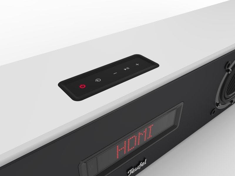 De vier luidsprekers in de soundbar vallen uiteraard direct op. Ze hebben namelijk een behoorlijk uitgesproken ontwerp. Twee van de luidsprekers kijken je aan en de andere twee zijn naar de zijkanten gericht. Teufel wil hiermee zorgen voor een breed geluidsveld. De twee ovale, zwarte vlakken die je wat verder naar het midden van de soundbar vindt, zijn baswoofers. Het is mogelijk om draadloos een Teufel-sub aan dit systeem te verbinden, maar het idee achter deze Ultima-set is dat dat niet direct nodig is voor een overtuigende vertaling van lage frequenties.
