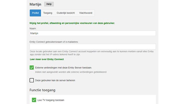 Via Gebruikers kun je anderen toegang geven tot (de mediabibliotheken van) Emby. Dat doe je via de plusknop, waarna je Lokale gebruiker toevoegen kiest. Geef een naam op en regel tot welke bibliotheken deze gebruiker toegang krijgt. Bevestig met Opslaan. Vervolgens kun je de rechten en mogelijkheden van die gebruiker tot in detail instellen. Klik daarvoor op het knopje met de drie puntjes bij de gebruiker en dan op Openen. Op het tabblad Profiel regel je toegang tot diensten en functies.