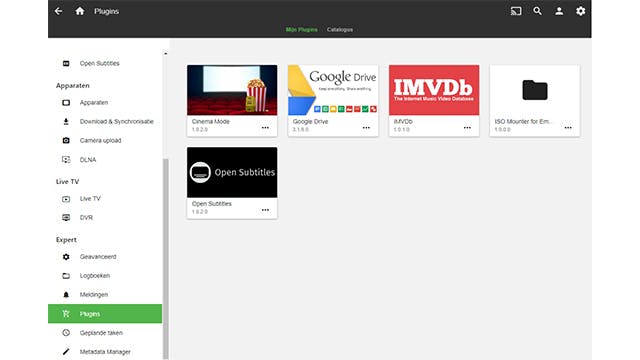 In de rubriek Expert vind je verder het item Plugins. Standaard zijn onder meer al IMVDb en Open Subtitles geïnstalleerd, maar via Catalogus kun je nog uit enkele tientallen plug-ins kiezen, opgedeeld in verschillende rubrieken. Meestal is installatie een kwestie van de plug-in aanklikken en op Install te drukken, waarna je wellicht de server even moet herstarten. Bij de geïnstalleerde plug-in kun je dan via het knopje met de drie puntjes de nodige instellingen aanpassen.
