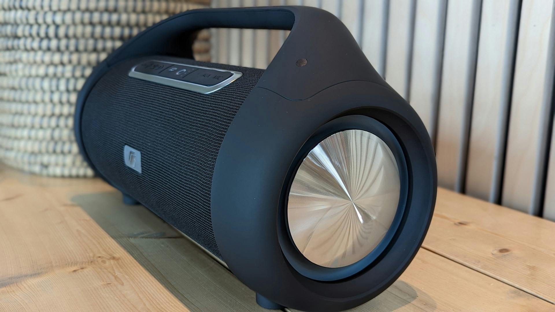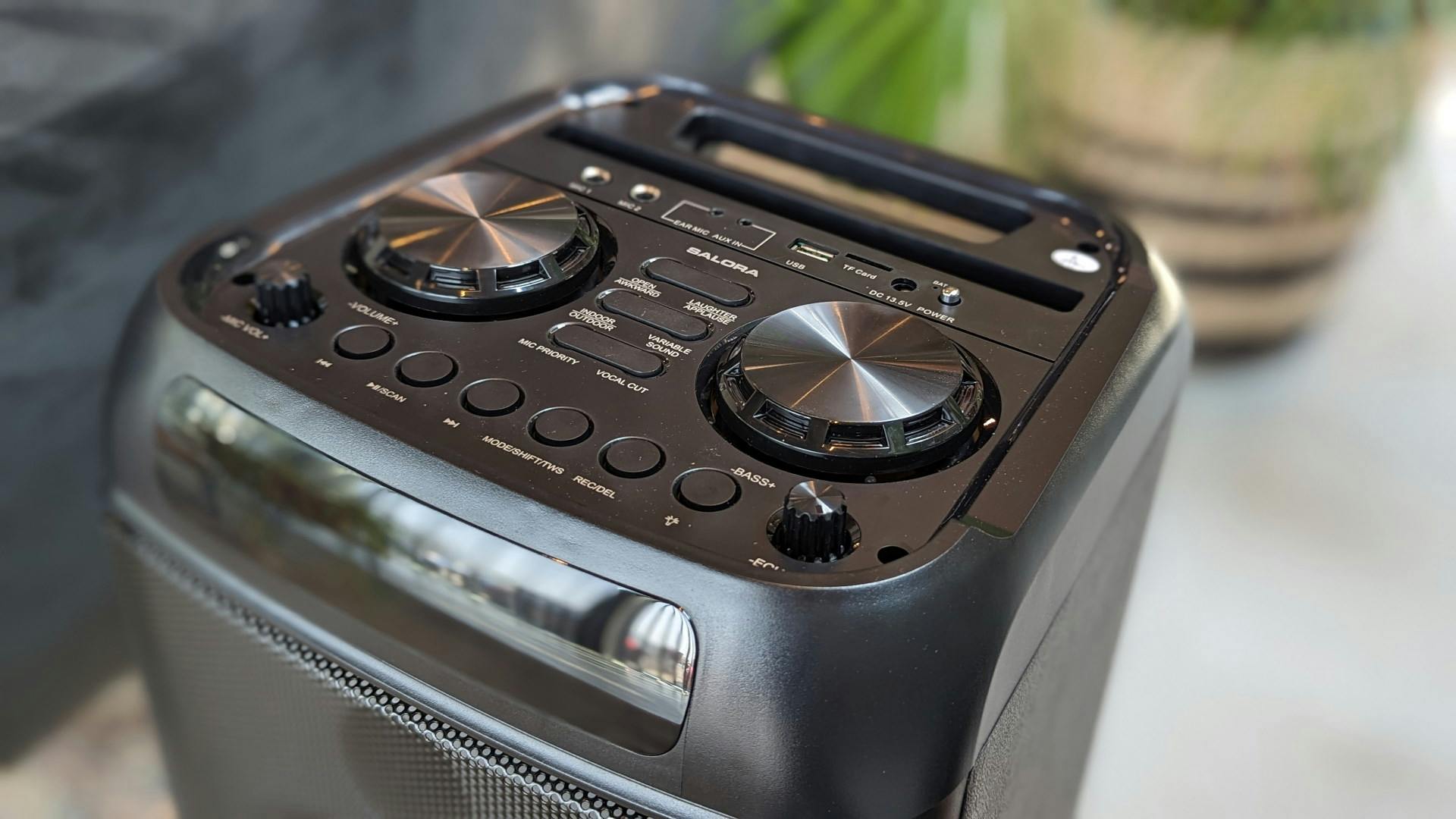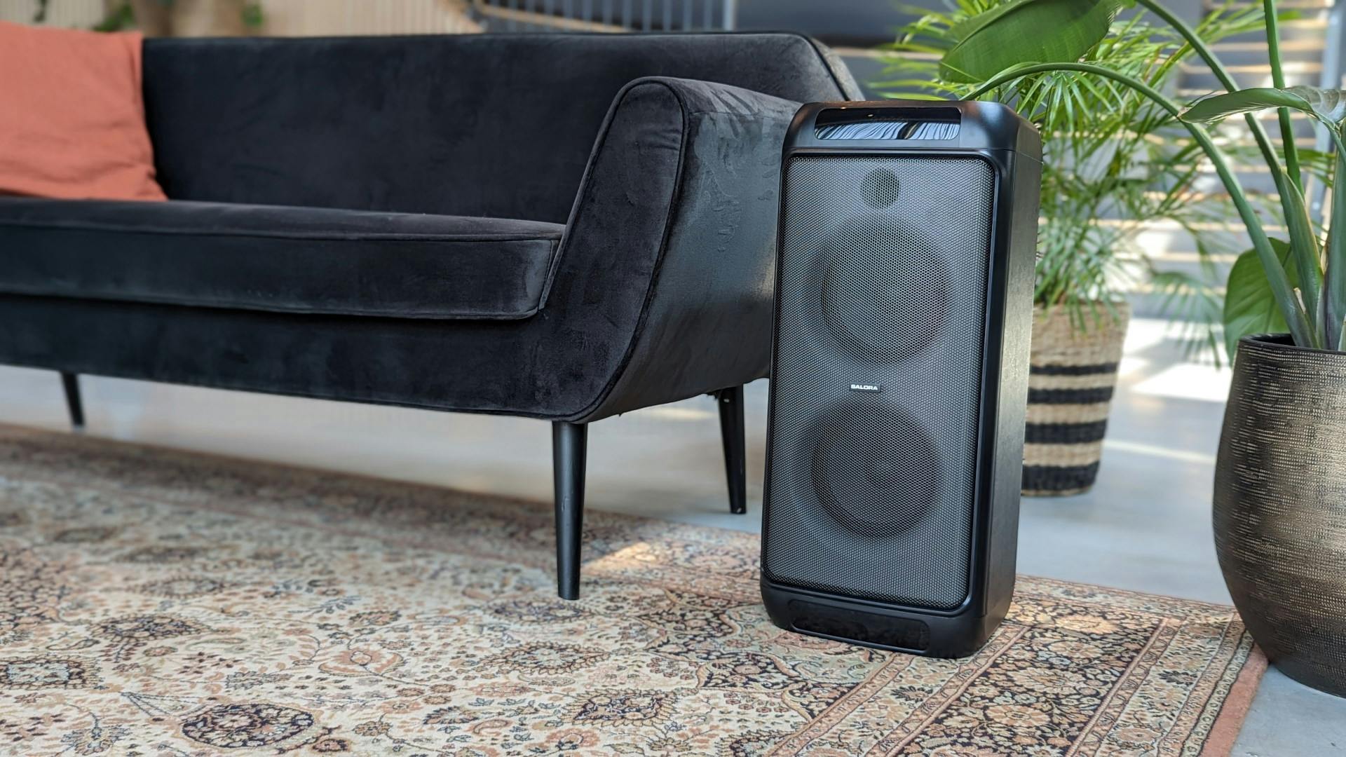 Het grote formaat van een heuse partyspeaker. Inclusief feestverlichting en (draai)knoppenset aan de bovenzijde die doet denken aan de gettoblaster van weleer. Voor een prijs rond de honderd euro. Dat is goedkoper dan de miniformaatjes van JBL die ook aan bod komen in dit artikel. De partybox is 62 bij 27 bij 25 centimeter groot en weegt meer dan 7,5 kilo. Een bedrade microfoon wordt meegeleverd. Waterbestendig is de Salora PartySpeaker L1 niet.