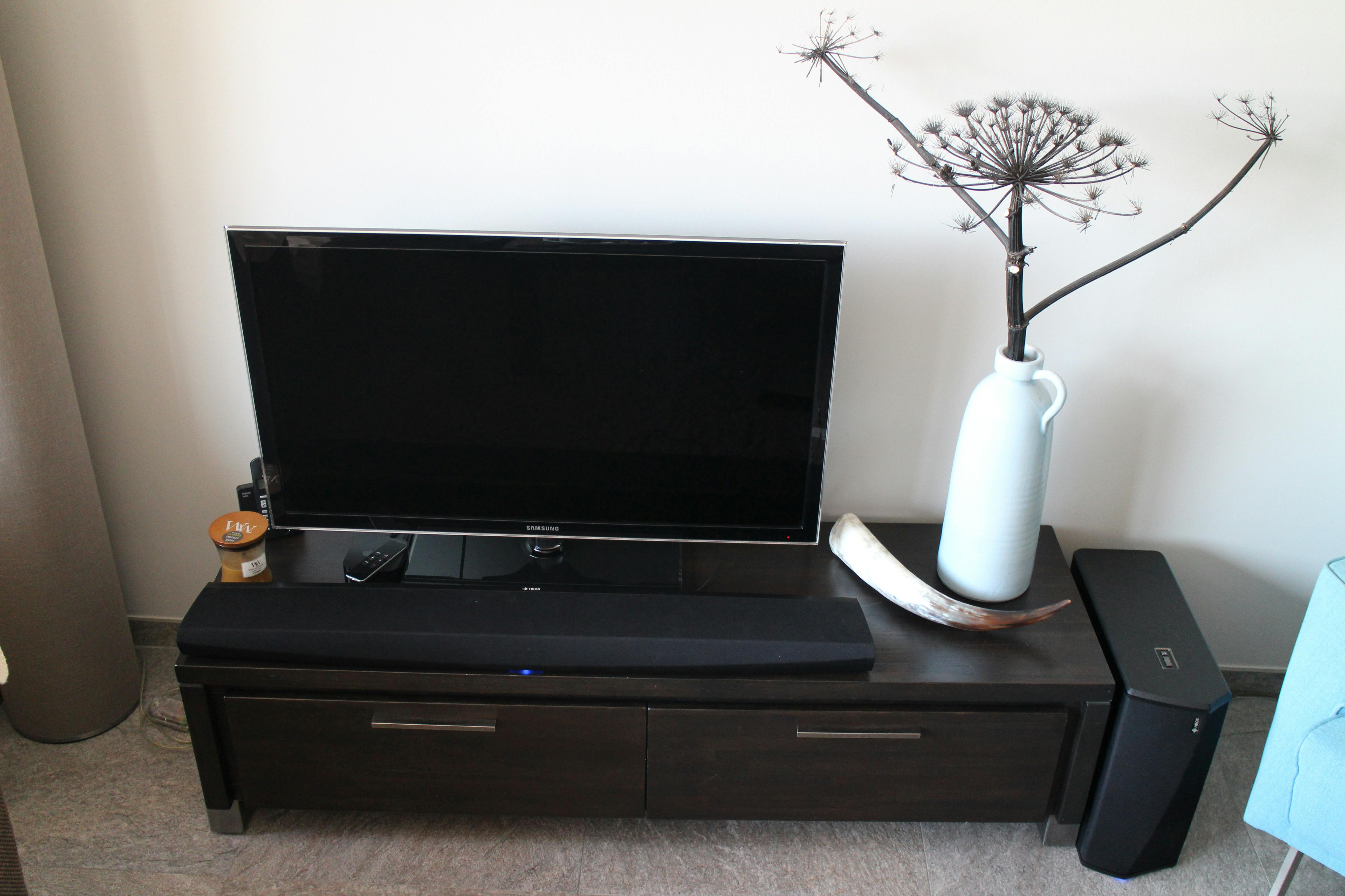De HEOS Bar wordt geleverd met pootjes, waarmee de soundbar iets kunt verhogen zodat deze boven de steunpilaar kan zweven en dichter bij de televisie kan staan. Ook het mogelijk om de Bar aan de wand te bevestigen, voor het geval je televisie ook aan de wand bevestigd is.