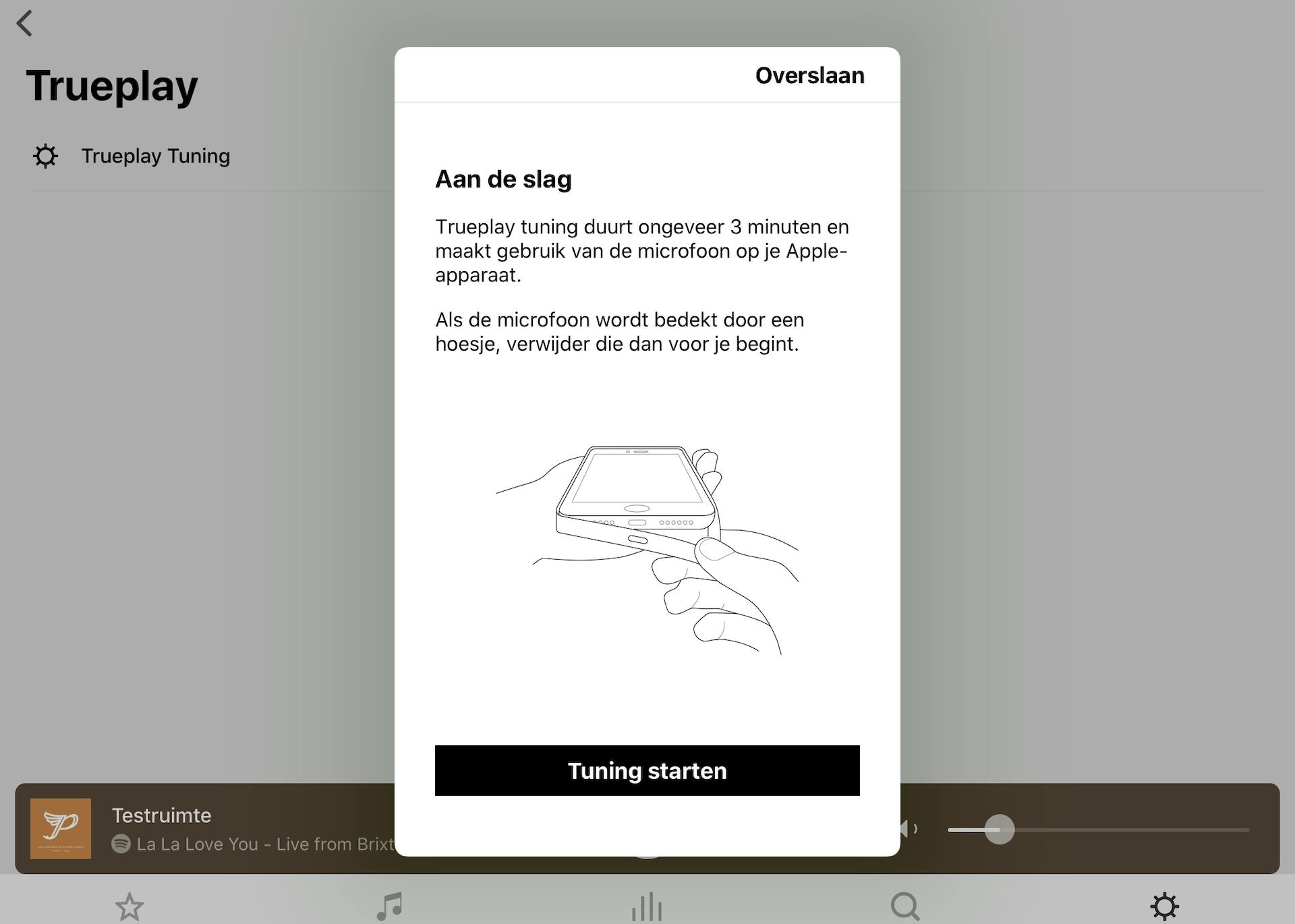 Als je eenmaal de extra speakers geïnstalleerd hebt, vergeet dan de Trueplay-functie niet. Met Trueplay wordt je nieuw surroundsysteem helemaal aangepast aan jouw woonkamer. Elke ruimte beïnvloedt namelijk wat je hoort. Zo kunnen met name bassen heel luid overkomen ten opzichte van spraak. Met Trueplay trek je dit recht. Het instellen van Trueplay duurt ongeveer tien minuten en doe je bij voorkeur niet ’s avonds laat (tenzij je in een vrijstaand huis woont). Er komen namelijk wat luide tonen aan te pas.