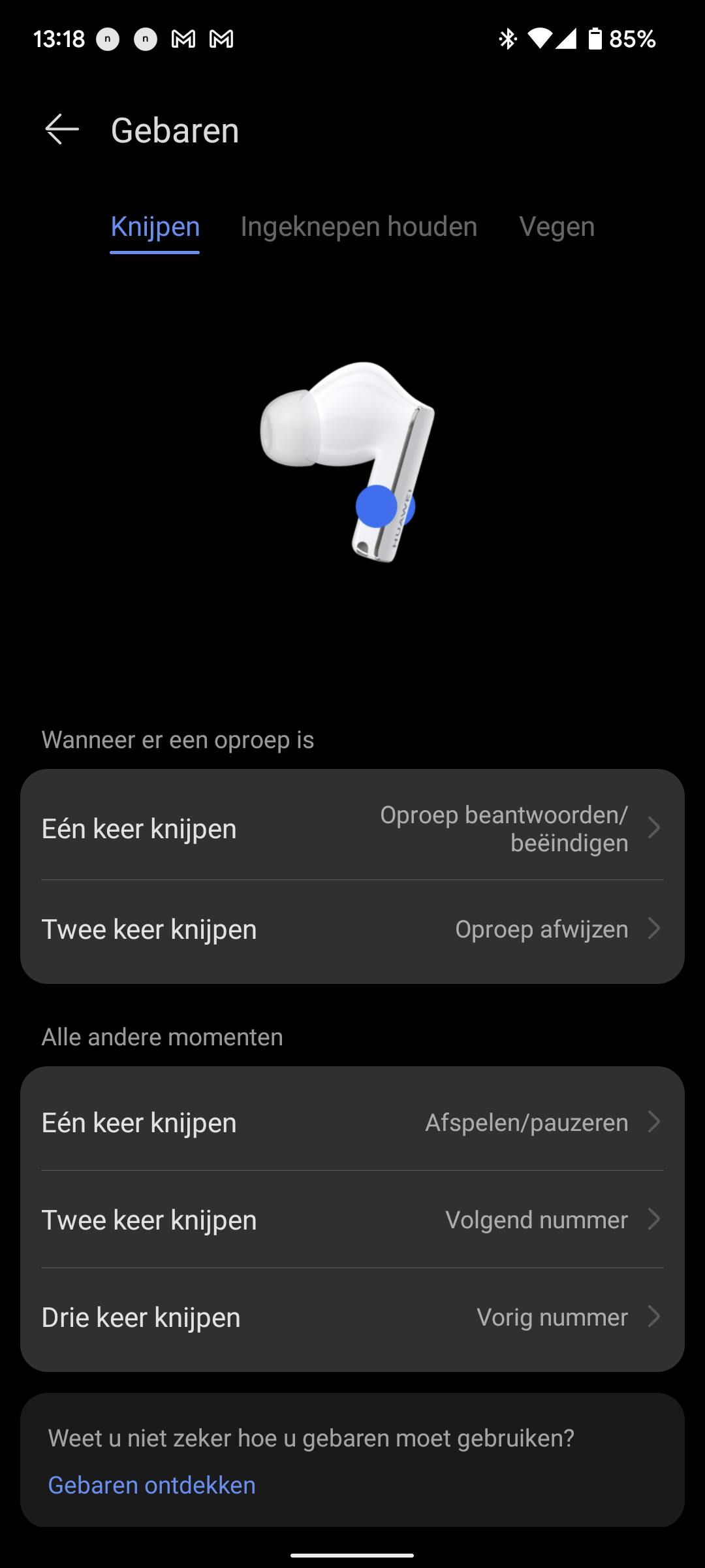 De app kun je verder onder meer gewoon gebruiken om een geluidsprofiel te kiezen of zelf met schuifjes aan de equalizer te zitten, de bediening in te stellen, afspeelmodi te configureren of de oortjes te updaten. Die bediening van de oortjes gebeurt door in het steeltje te knijpen, niet door op het oortje te tikken. In praktijk niet bepaald een betere bedieningsmogelijkheid.