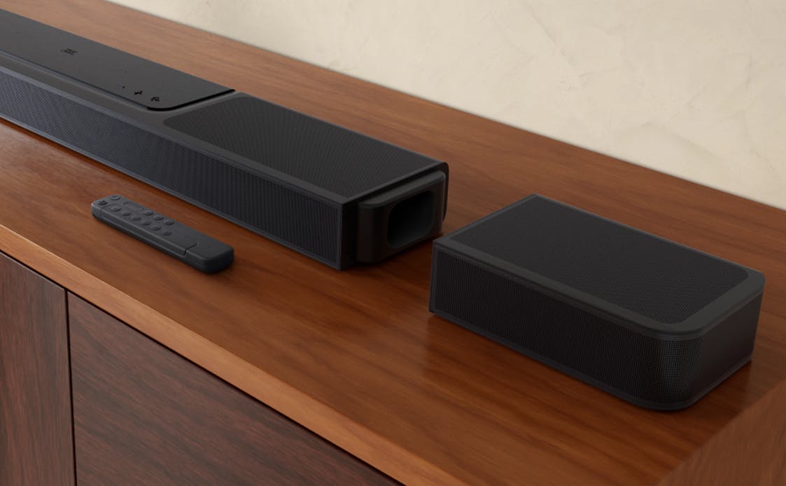 Voor een realistisch Dolby Atmos-geluid vervullen opwaartse audiodrivers een sleutelrol. Dat zit bij de Bar 1300 wel goed. De soundbar heeft namelijk vier omhoog gerichte minispeakers met een volledig bereik. Die sturen het geluid van pakweg een overvliegende helikopter of F35 naar boven, waarna deze audiogolven weerkaatsen tegen het plafond. Hierdoor hoor je luchtvaartuigen daadwerkelijk boven je hoofd. De afneembare surround-speakers hebben elk eveneens een opwaartse audiodriver. Hoor bijvoorbeeld achter je een vliegtuig opstijgen!