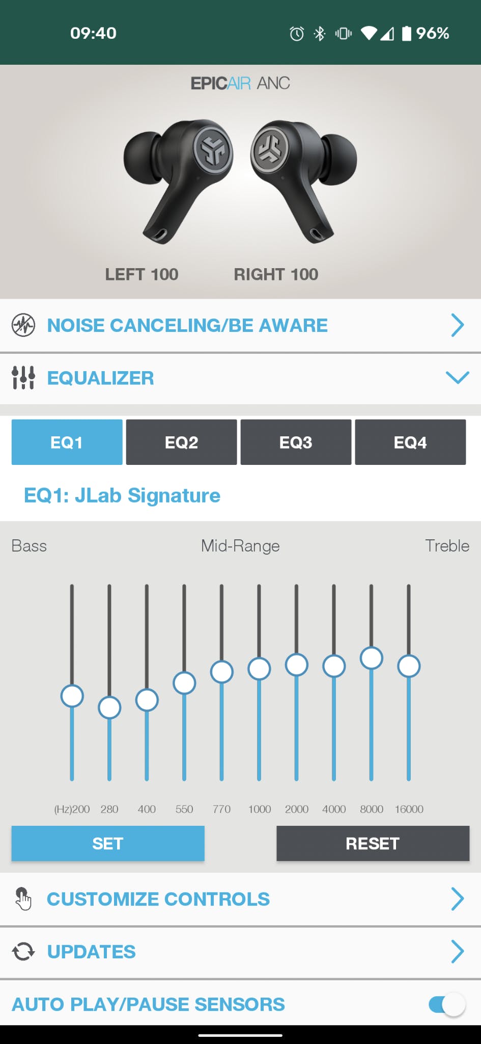 JLab biedt een app aan voor de oortjes, die wat gedateerd oogt, maar doet wat het moet doen. Firmware-updates, touchbediening configureren en er is een equalizer om zelf de muziekafstelling te regelen. Deze equalizer heeft vier presets, waarbij het geluid het beste in balans klinkt bij de ‘JLab Signature’ afstelling. Gebruik de app zeker even om de firmware te updaten, bijvoorbeeld om een bug die af en toe zorgt voor verbindingsproblemen te tackelen.