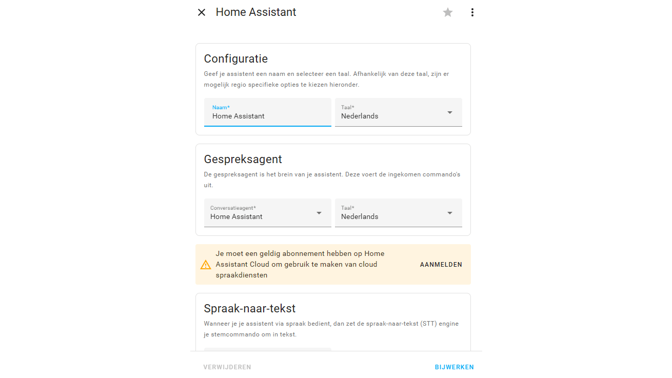 Klik op de assistent. Zorg dat onder het kopje Configuratie de taal op Nederlands staat. De instelling bij Gespreksagent wordt automatisch aangepast. De andere instellingen kun je nog ongemoeid laten, die komen verderop aan bod. Klik op Bijwerken om de veranderingen op te slaan.