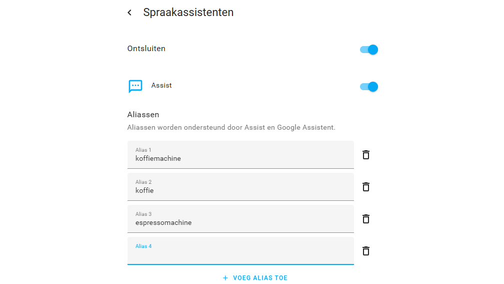Je kunt nu een voor een zogenoemde aliassen toevoegen, zoals koffie en koffiemachine. De assistent weet dan dat je met die woorden dat specifieke apparaat bedoeld. Het streven is om gesproken opdrachten te kunnen gebruiken. De hier toegevoegde aliassen zullen ook bij spraakopdrachten worden gebruikt.