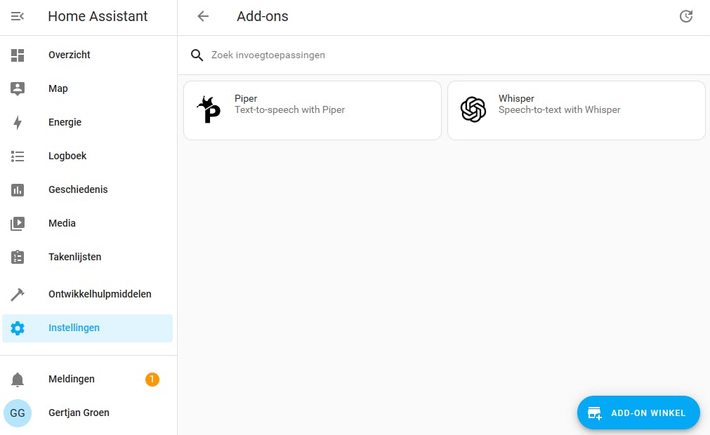 - Installatie add-on Whisper voor omzetting spraak naar tekst