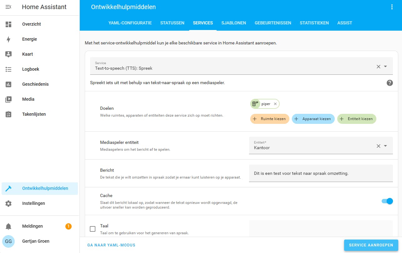 Je kunt de integratie eenvoudig uitproberen via Ontwikkelhulpmiddelen / Services. Zoek bij Service naar Text-to-speech (TTS): Spreek. Klik achter Doelen op Entiteit kiezen en kies piper. Achter Mediaspeler entiteit kies je een mediaspeler waarop het bericht moet worden afgespeeld. Achter Bericht voer je een tekstbericht in.