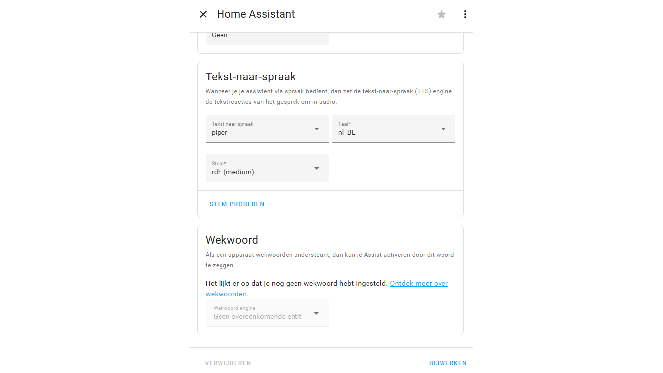 We kunnen nu ook de instellingen voor onze assistent aanpassen. Ga daarvoor naar Instellingen / Spraakassistenten en selecteer je assistent. Bij Tekst-naar-spraak kun je Piper met de gewenste taal en stem kiezen. We gaan hier uit van de stem nl-rdh-medium. Selecteer in dit geval bij Taal de optie nl_BE. Bij Stem kies je vervolgens rdh (medium).