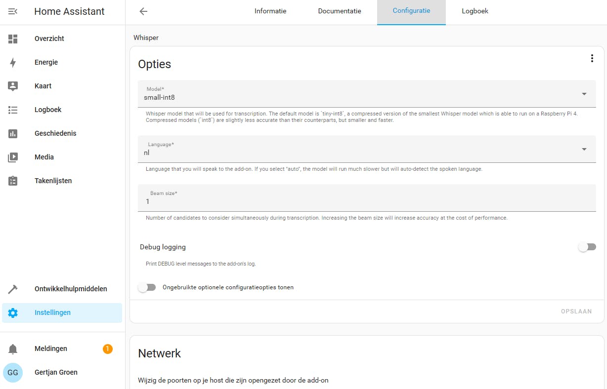 Kies Opslaan als je klaar bent met het aanpassen van de configuratie. Ga dan terug naar het tabblad Informatie, klik op Watchdog / Starten. Voeg daarna ook de integratie voor Whisper toe onder Instellingen / Apparaten & diensten. Open ook weer de instellingen voor de assistent onder Instellingen / Spraakassistenten. Kies onder het kopje Spraak-naar-tekst voor faster-whisper met de taal Nederlands. Bewaar de aanpassingen met Bijwerken.
