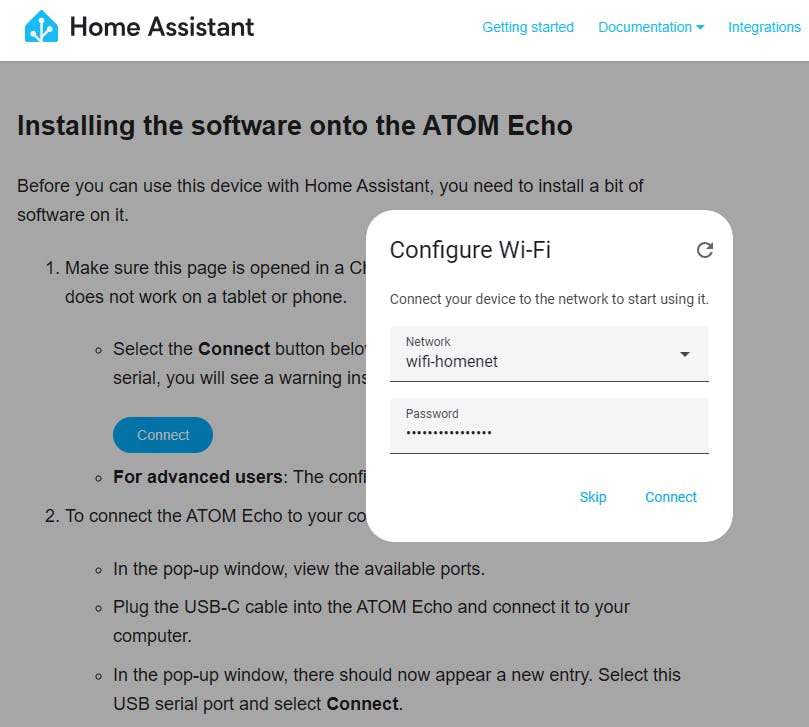 Is de installatie klaar, kies dan Next. Je kunt nu het wifi-netwerk kiezen dat de Atom Echo moet gaan gebruiken en het bijbehorende wachtwoord invoeren. Vul dit in en klik op Connect. Nadat je de wifi hebt ingesteld, wordt er geprobeerd om verbinding te maken. Daarna verschijnt als het goed is de melding dat de Atom Echo is verbonden met Home Assistant.