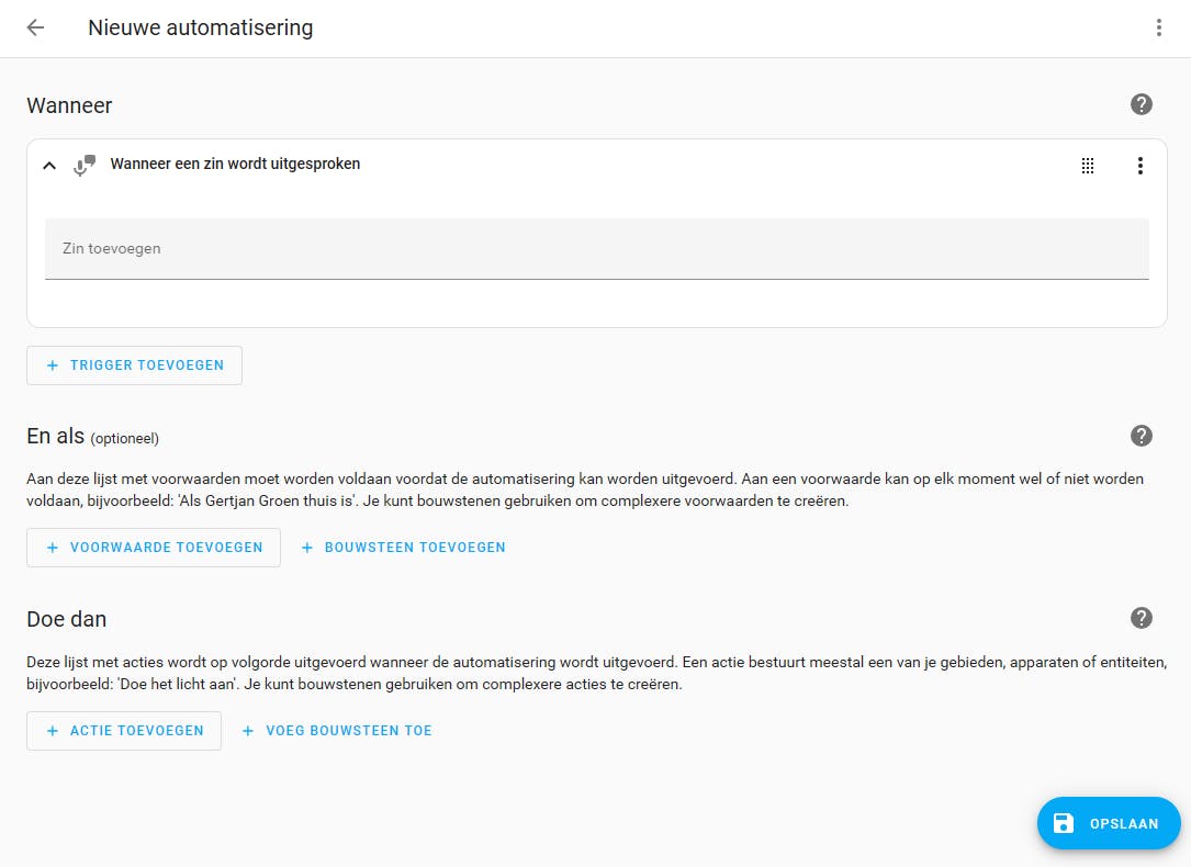 Wat de assistent nog een stuk krachtiger maakt, is dat je persoonlijke zinnen kunt gebruiken om een automatisering te starten. Hiervoor maak je een nieuwe automatisering. Kies dan als trigger de optie Zin. Je kunt nu de tekst invullen die als trigger moet dienen. Vervolgens kies je eventuele voorwaarden en acties.