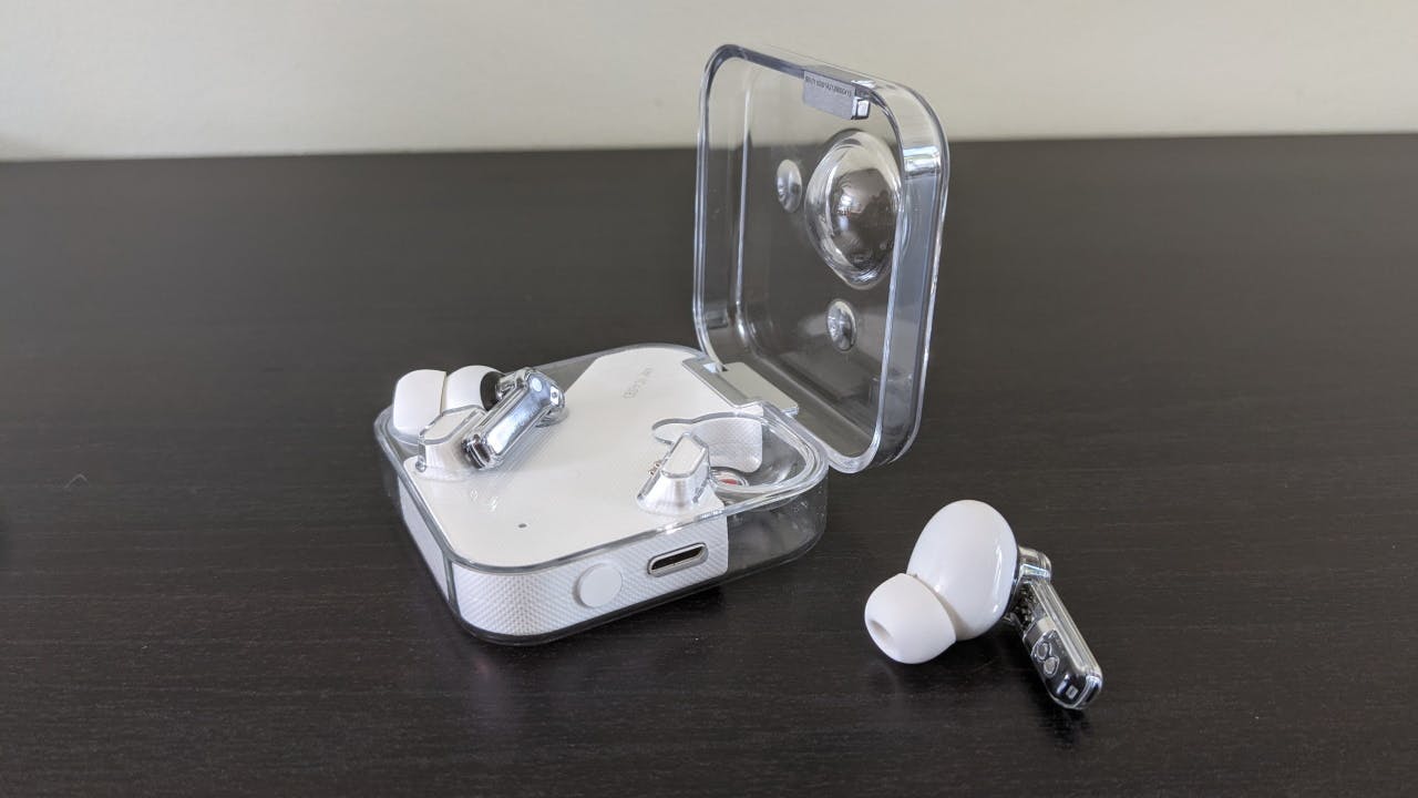 Het oplaaddoosje heeft een vergelijkbaar ontwerp met transparante en witte delen. De oortjes plaats je er wat onhandig in terug en het doosje is wat aan de grote kant. Er is wel ruimte gemaakt voor een draadloze oplaadmogelijkheid en een usb-c-poort. Een opgeladen case kan de oortjes zo’n negen keer volledig opladen met zijn accucapaciteit.