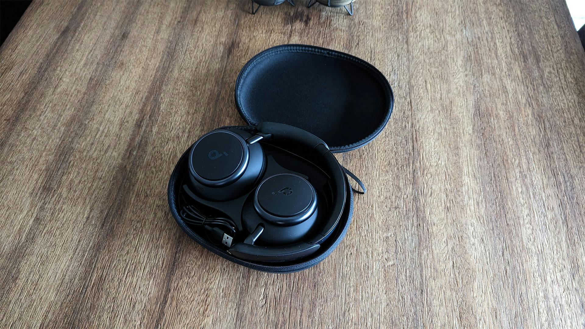 Anker levert de Soundcore Space Q45 in een relatief goedkoop voelend hoesje. Dat hoesje is niet stevig en gemakkelijk in te drukken, maar lijkt de koptelefoon desondanks prima te beschermen. In de beschermhoes zit een dunne, plastic inleg waar je de koptelefoon op kunt leggen. Dit voelt totaal niet premium aan. We snappen dat dit geen high-end koptelefoon is, maar je mag je hardop afvragen of je dit soorten ervaringen wil overbrengen als fabrikant. Hier heeft niemand wat aan.