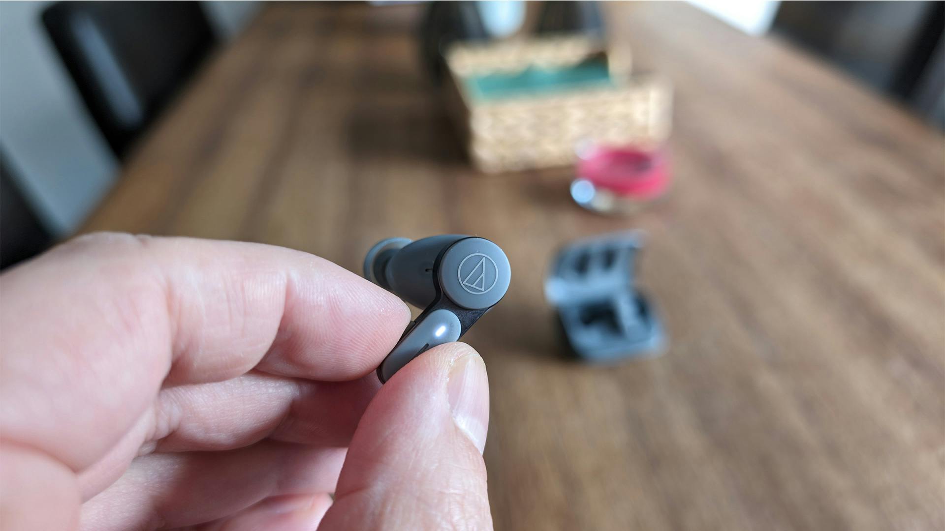 Daarnaast heeft elke oordop nog een knopje op z’n stam zitten. Daarmee kun je het volume verhogen en verlagen, en muziek pauzeren en afspelen. Ook kun je naar een volgend of vorig nummer gaan, door een van de twee knopjes één keer of meerdere keren in te drukken. Binnen de A-T-app is het overigens mogelijk de functie van de knopjes aan te passen en in het geval van de aanraakgevoelige oppervlakten uit te schakelen. Dit is een opvallende hoeveelheid aanpassingsmogelijkheden die we zelden tegenkomen op een set oordoppen (van deze prijs), dus daar zijn we echt heel blij mee.