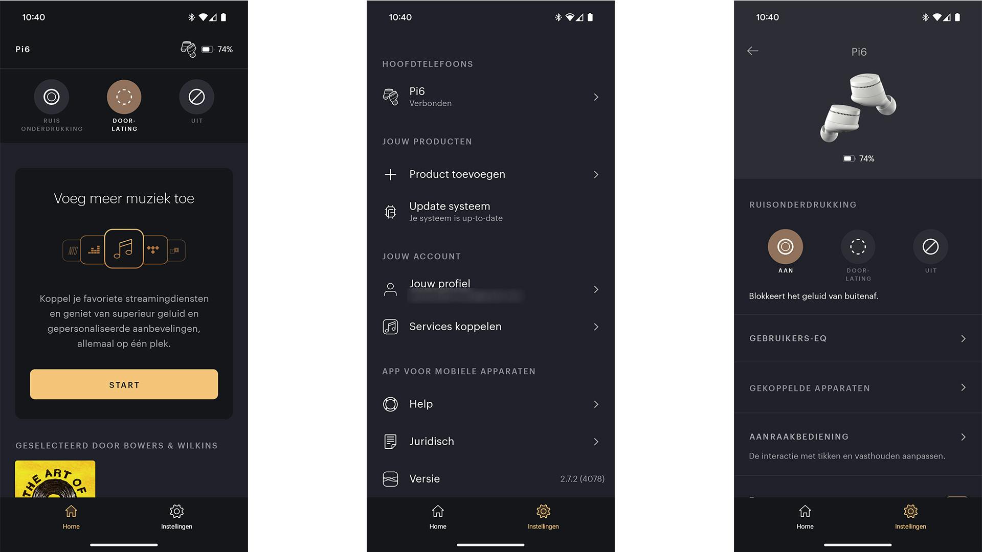Qua design valt de Bowers & Wilkins Pi6 dus wat tegen, en hetzelfde kunnen we stellen als het om het aantal (extra) functies gaat. Zo is de app niet heel uitgebreid. Je kunt de actieve ruisonderdrukking of de transparante modus aan- of uitzetten, gebruikmaken van een tweepuntsequalizer (voor alleen bass en treble) en de aanraakbediening aanpassen. Die bediening is daarnaast behoorlijk gevoelig. Als je je haar achter je oor wilt doen en je vinger komt langs dat oppervlakte, dan kan het zijn dat je de muziek pauzeert of ruisonderdrukking verandert.
