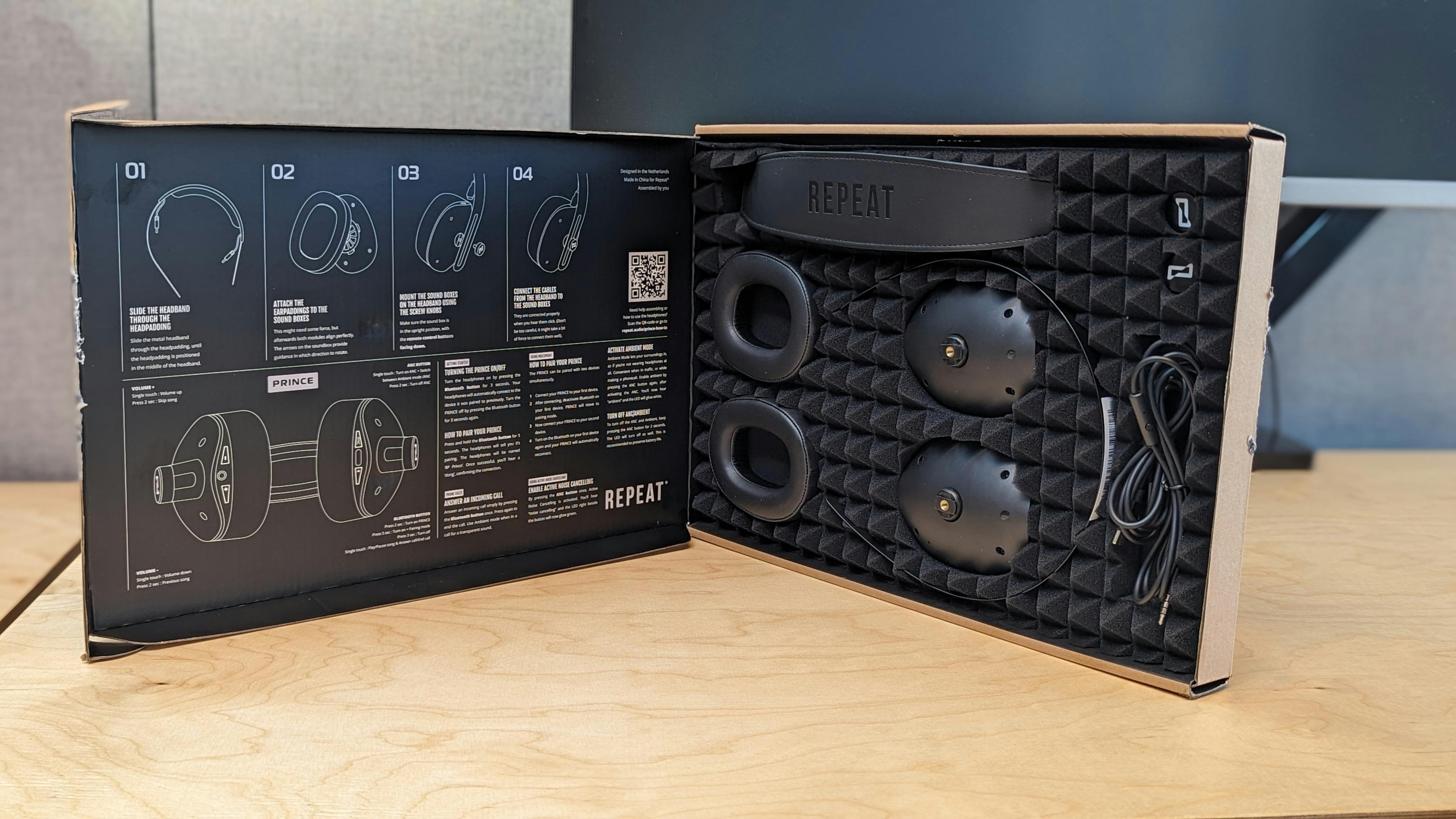 Het avontuur begint wanneer je de doos met de Repeat Audio Prince voorgeschoteld krijgt. Deze rechthoekige verpakking is toch veel te plat om een over-ear koptelefoon in te plaatsen? Wanneer je de verpakking opent zie je dat de losse onderdelen netjes zijn gepresenteerd, met een handleiding in de binnenzijde van de doos.