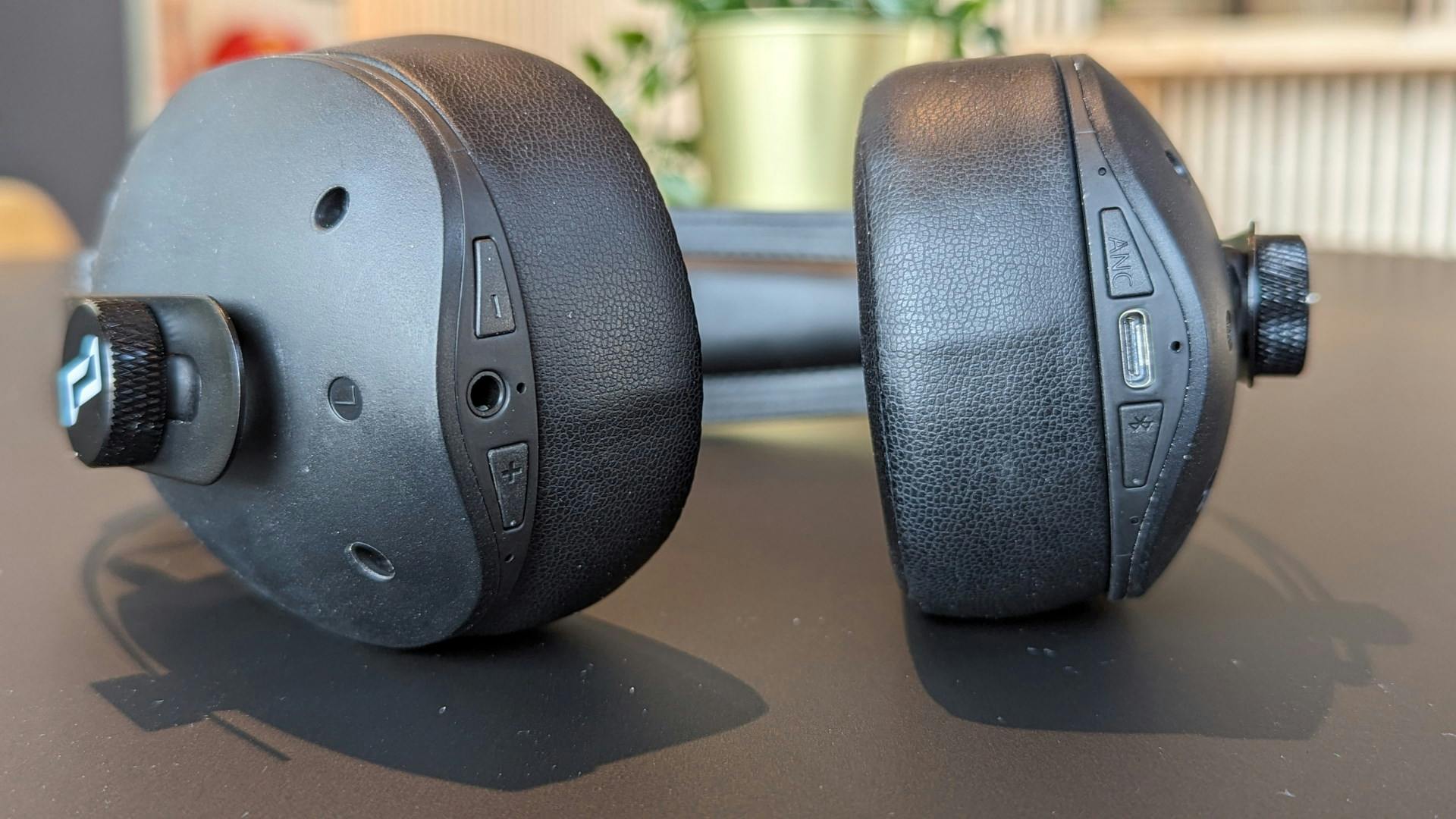 De constructie zorgt er ook voor dat tikbediening op de oorschelp niet tot de mogelijkheden behoort. Jammer, maar begrijpelijk. De bediening gebeurt met knopjes aan de onderzijde van de oorschelpen. Links zijn er naast de usb-c-poort een knop waarmee de koptelefoon aan zet of in pairingmodus zet en een knop waarmee je de ruisonderdrukkings- en transparantiemodus bedient. Rondom de audiopoort van de rechteroorschelp vind je een plus- en minknopje om het geluidsvolume te bedienen. Door een van de knoppen ingedrukt te houden kun je het volgende of vorige nummer afspelen.